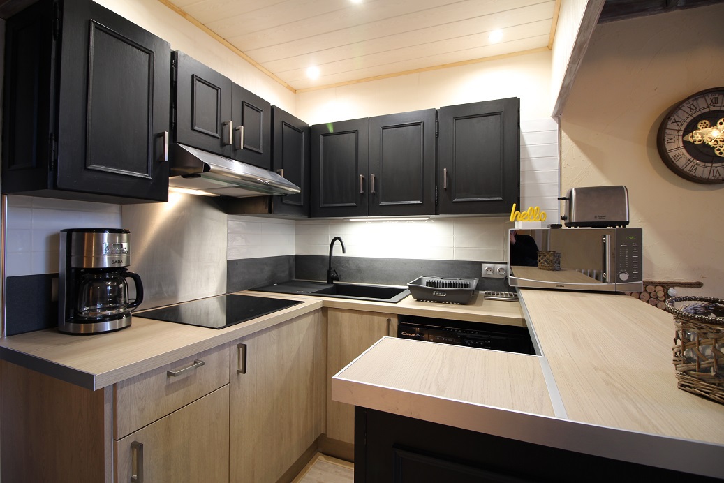 Cuisine US totalement équipée avec plaque induction 3 zones, hotte, four multifonctions, lave-vaisselle ...