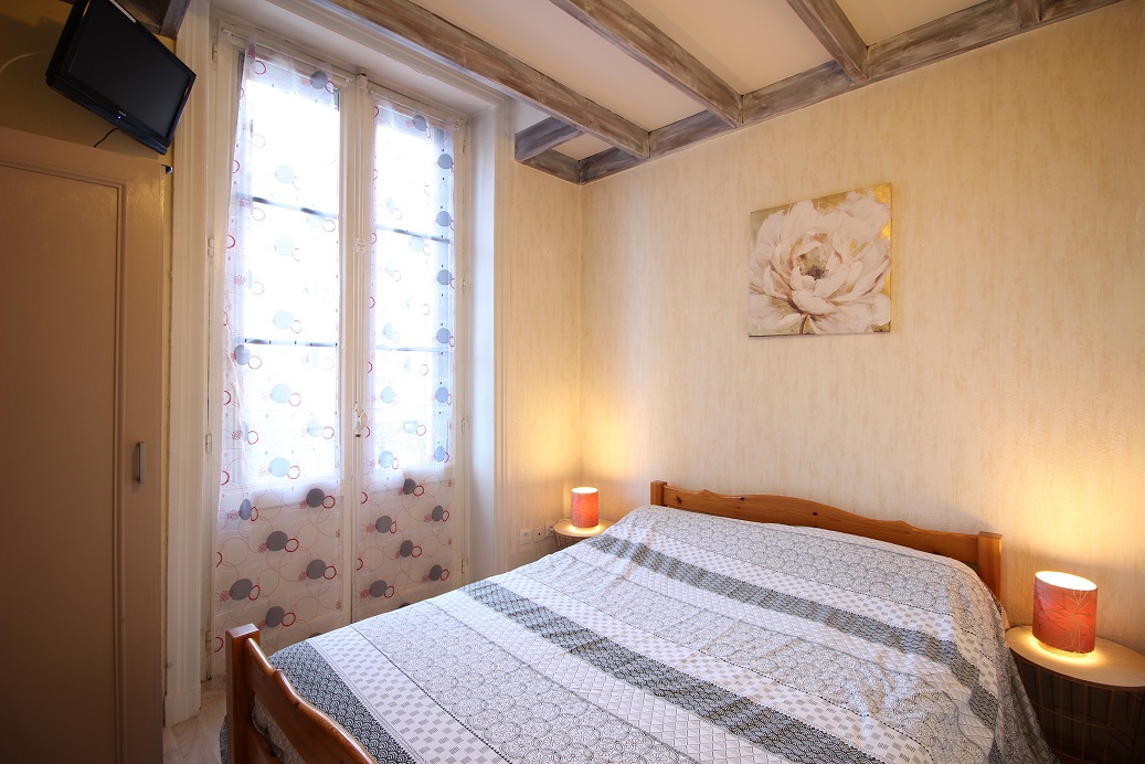une chambre avec un lit 2 personnes 140 et rangements ouvrant sur petit balcon,