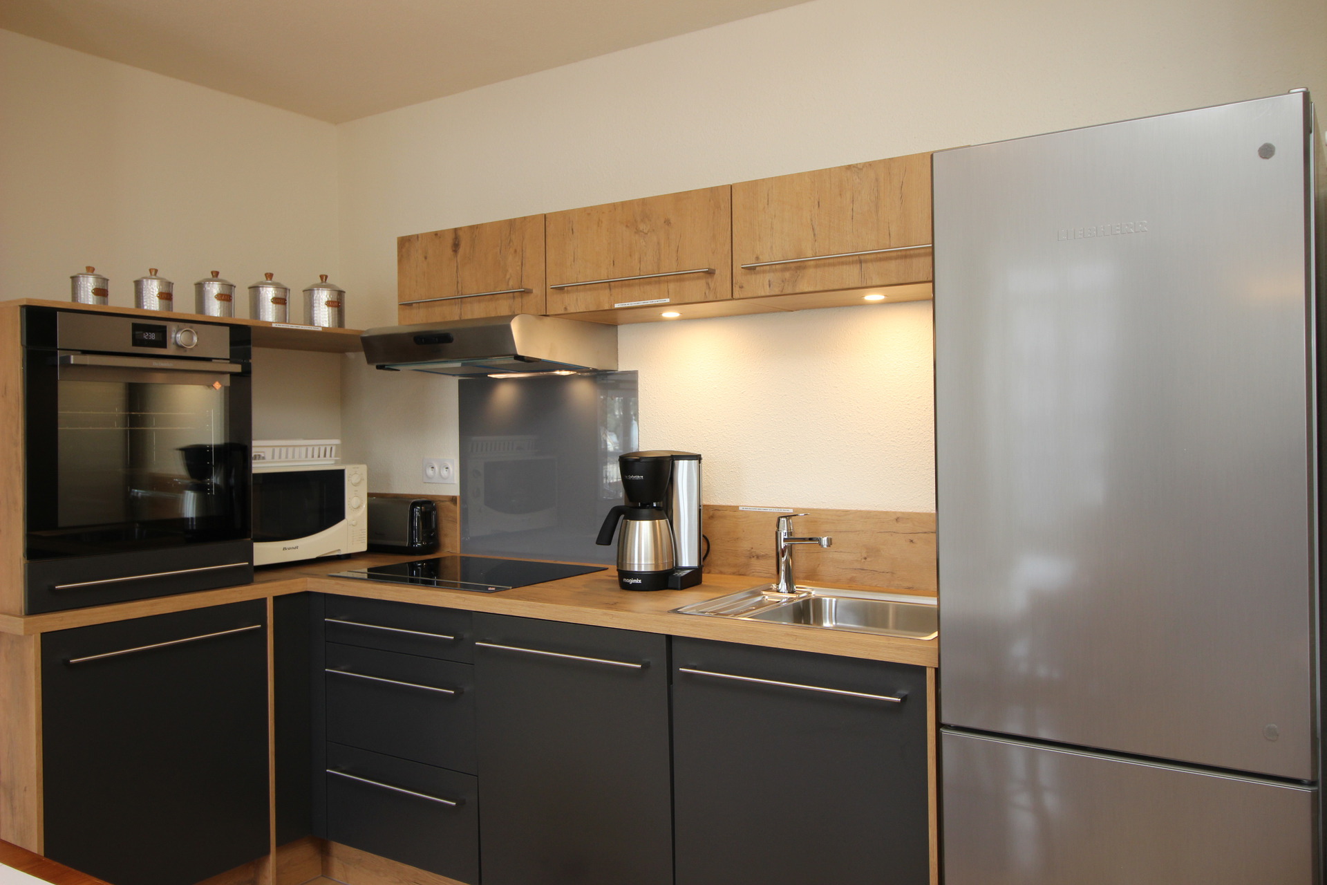 cuisine US équipée avec réfrigérateur/congélateur grand modèle, four, plaque électrique 2 feux, micro-ondes, lave-vaisselle. Lave-linge.