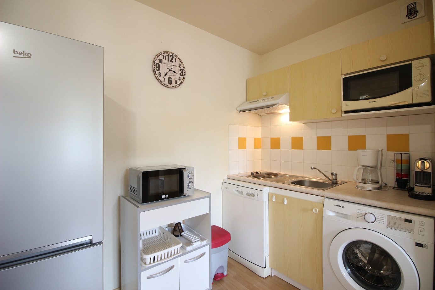 Cuisine US équipée avec plaque cuisson 2 zones, hotte, mini-four, micro-ondes, réfrigérateur grand modèle avec grand congélateur, lave-vaisselle, lave-line ...