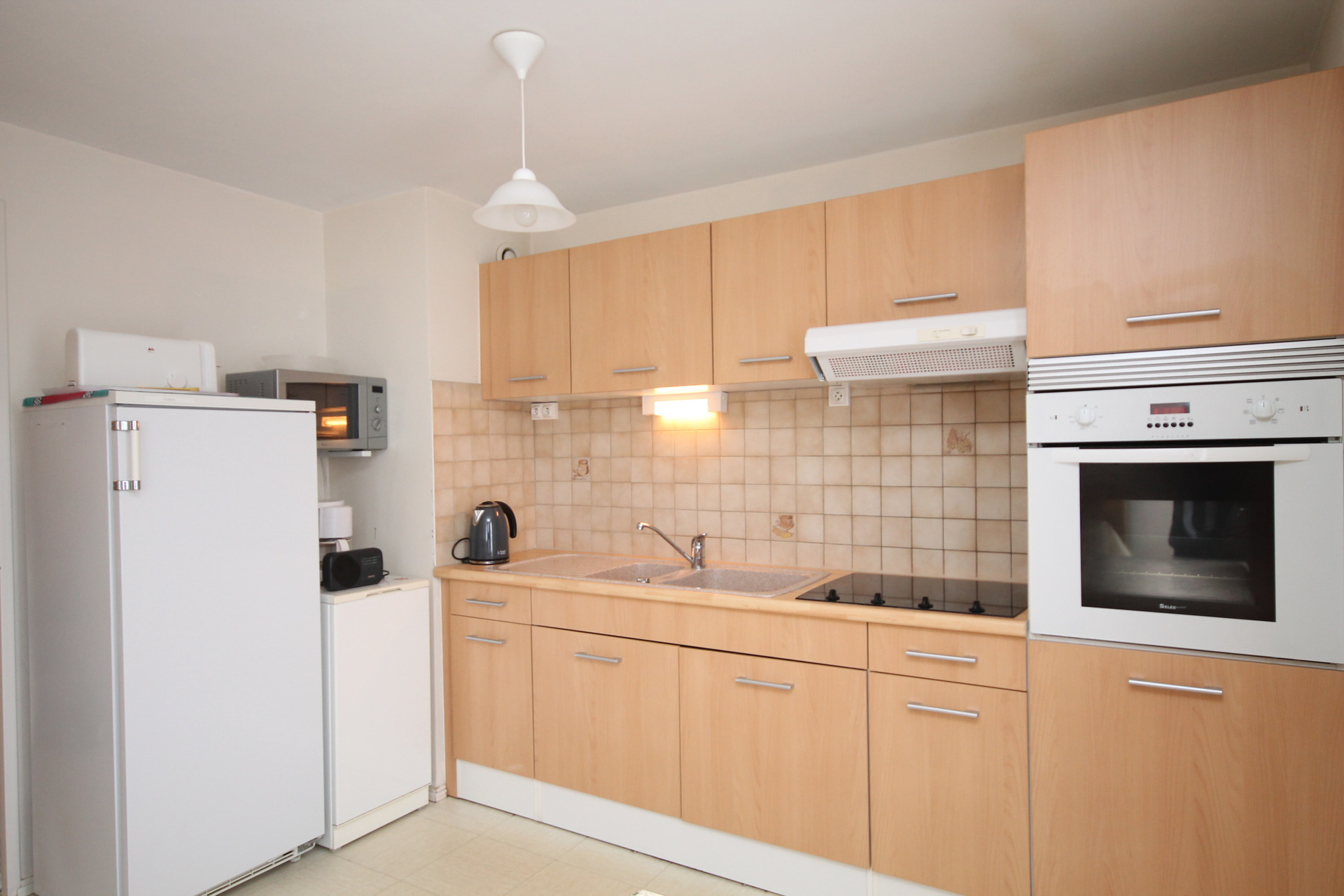 Cuisine équipée avec 4 feux vitrocéramiques, hotte, four, réfrigérateur grand modèle et micro-ondes