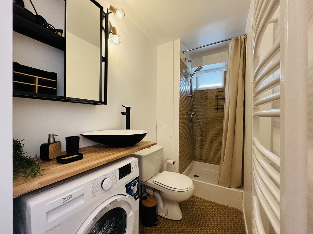 Mais encore, le studio dispose d'une salle d'eau avec douche, lave-linge et WC.