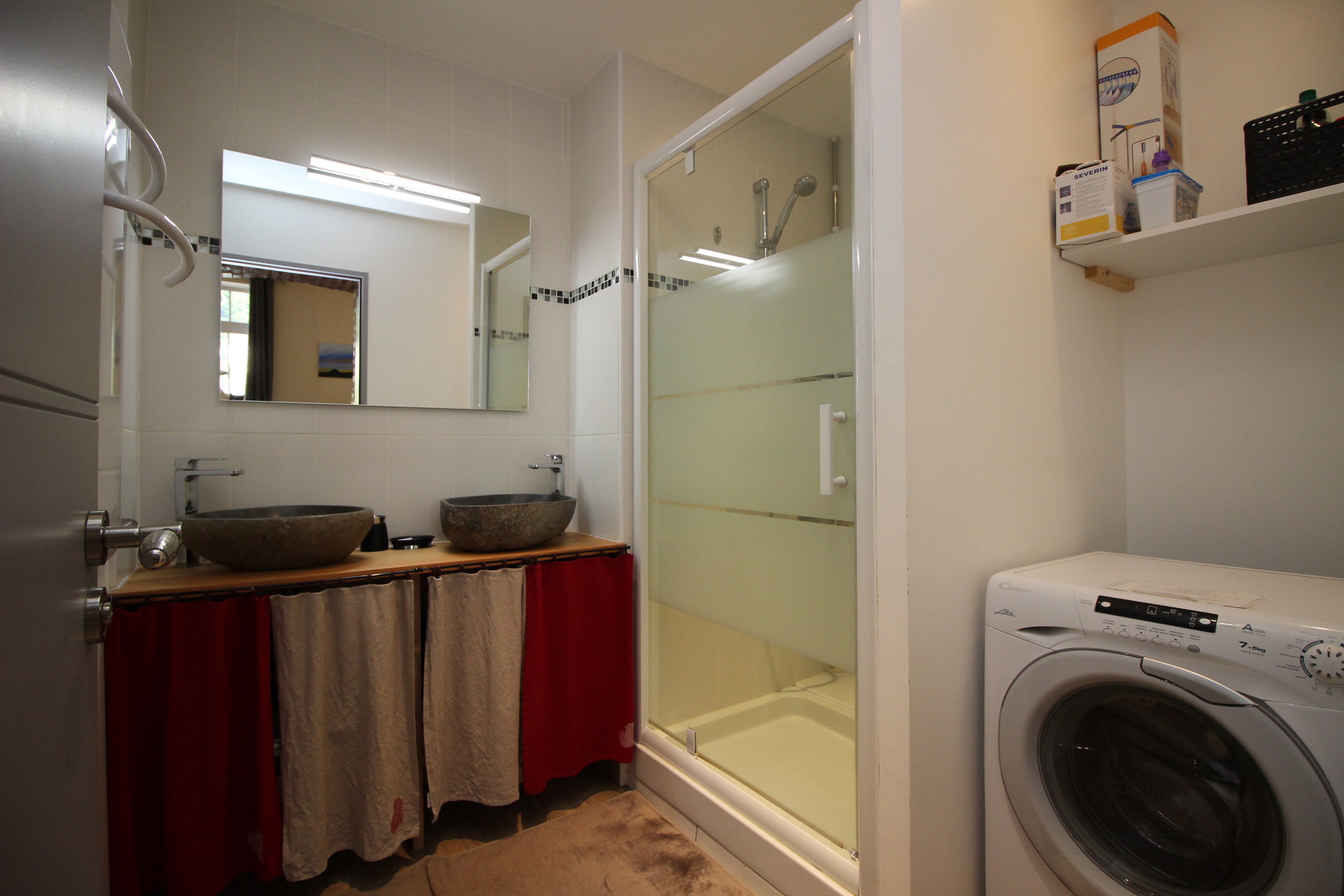 Salle d'eau (douche) avec sèche serviettes et lave-linge séchant.