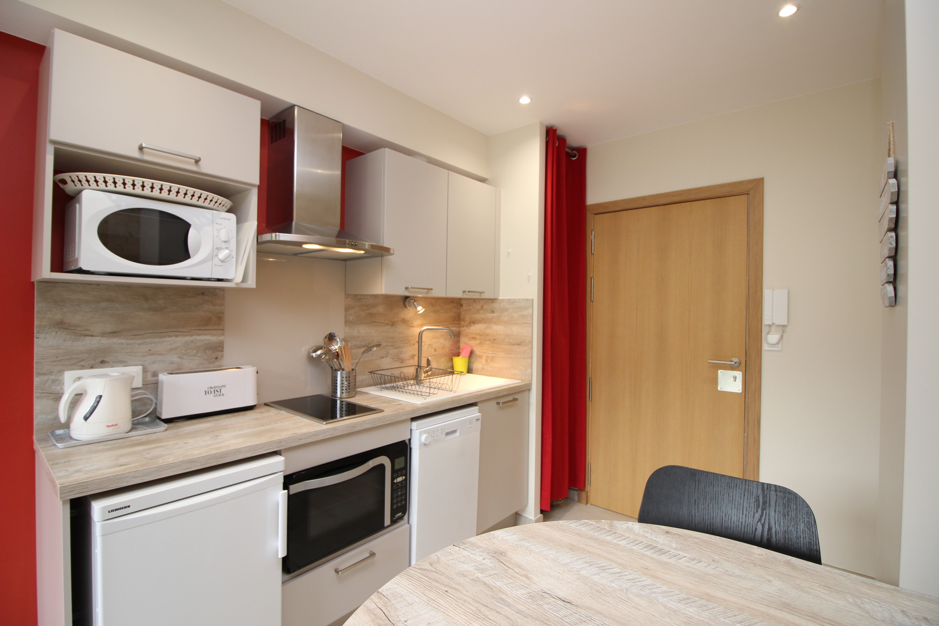 cuisine US totalement équipée avec plaque induction, four, micro-ondes, lave-vaisselle, réfrigérateur Top ...