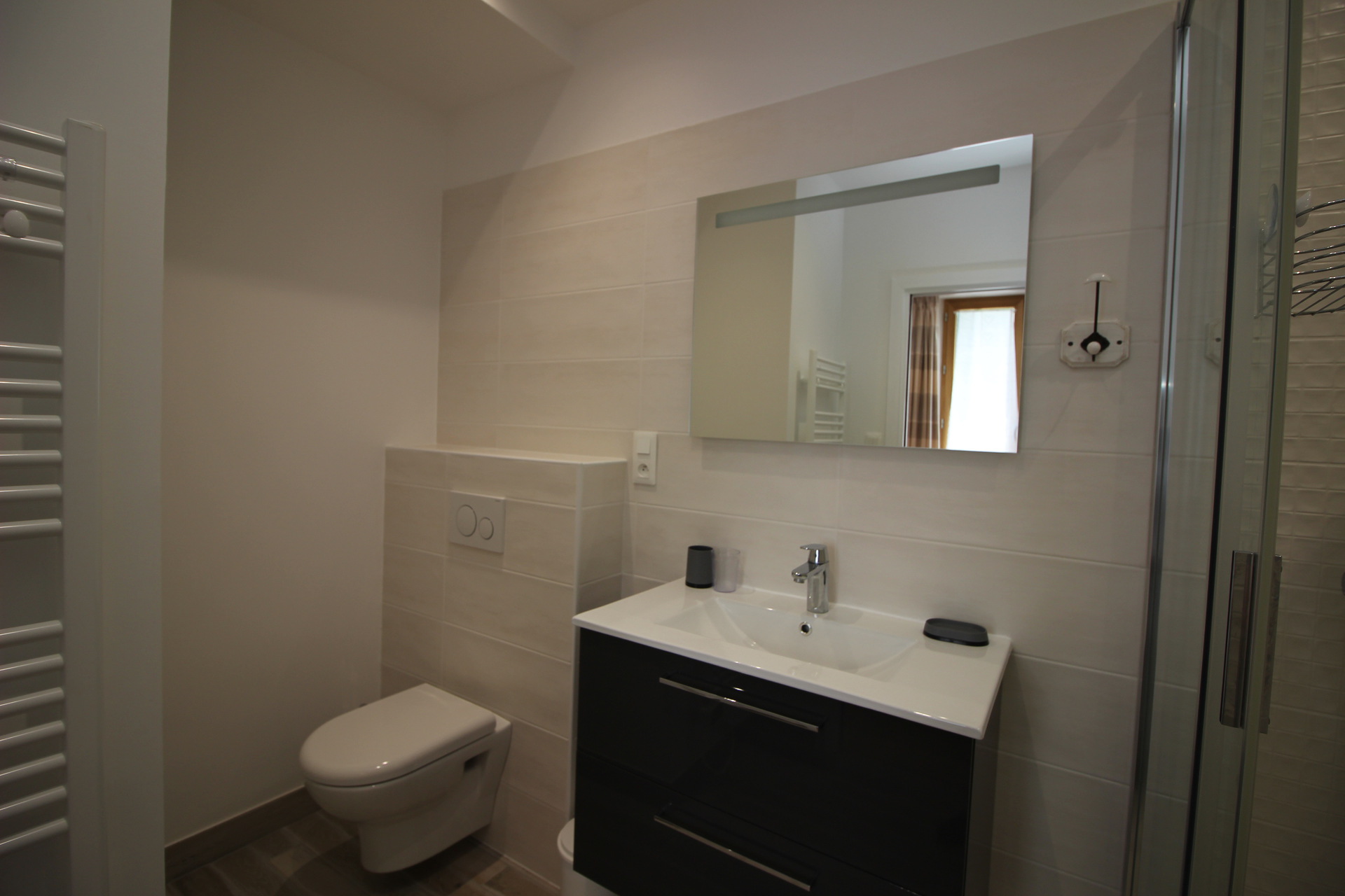 Une chambre lit 160, rangements et salle d'eau/wc (grande douche) avec sèche serviettes et lave-linge.