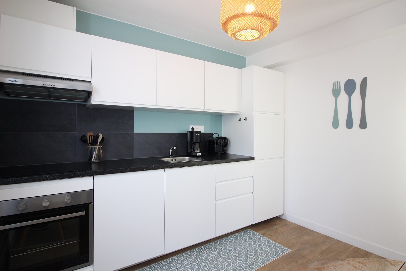 Une cuisine indépendante dans laquelle vous pouvez également prendre vos repas, totalement équipée avec plaque vitrocéramique 4 zones, hotte, four, micro-ondes, réfrigérateur grand modèle avec congélateur, lave-vaisselle ...