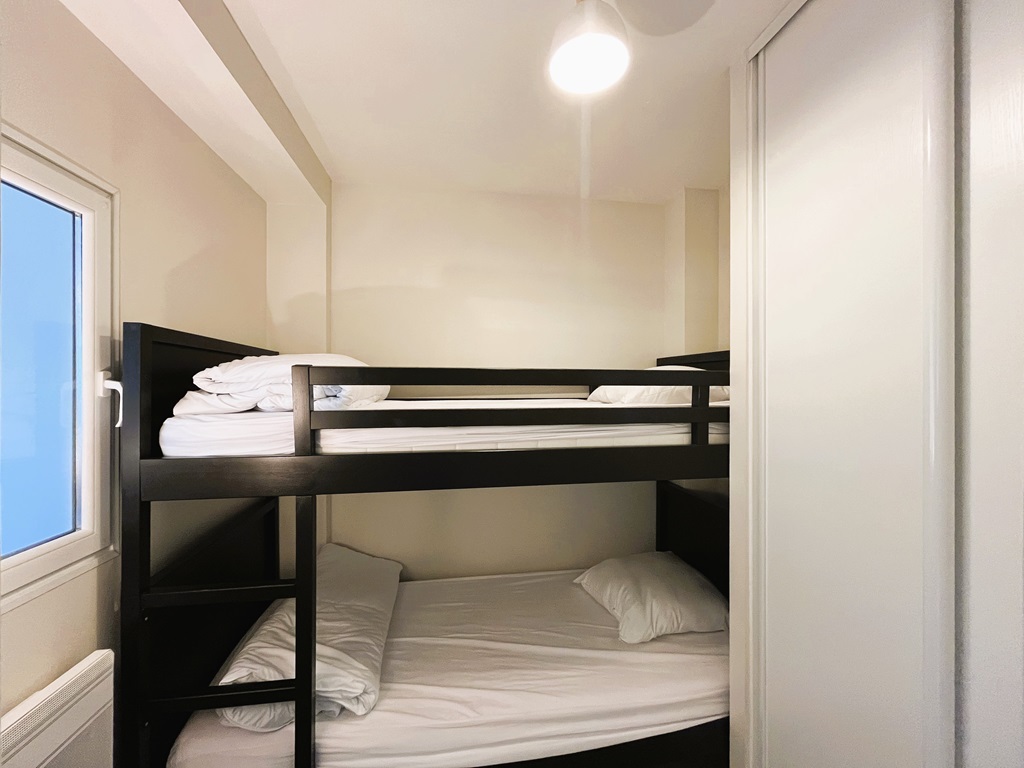 Mais encore, l'appartement dispose d'une grande chambre avec rangements et un lit double (en 160); ainsi qu'une petite chambre cabine avec un lit superposé (2 x 1 place).