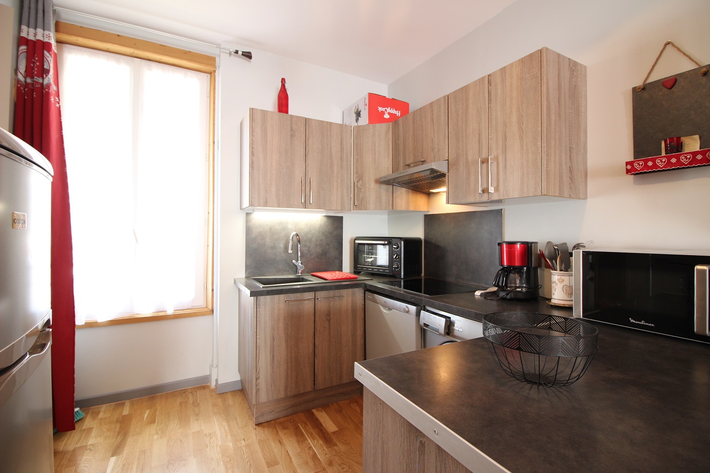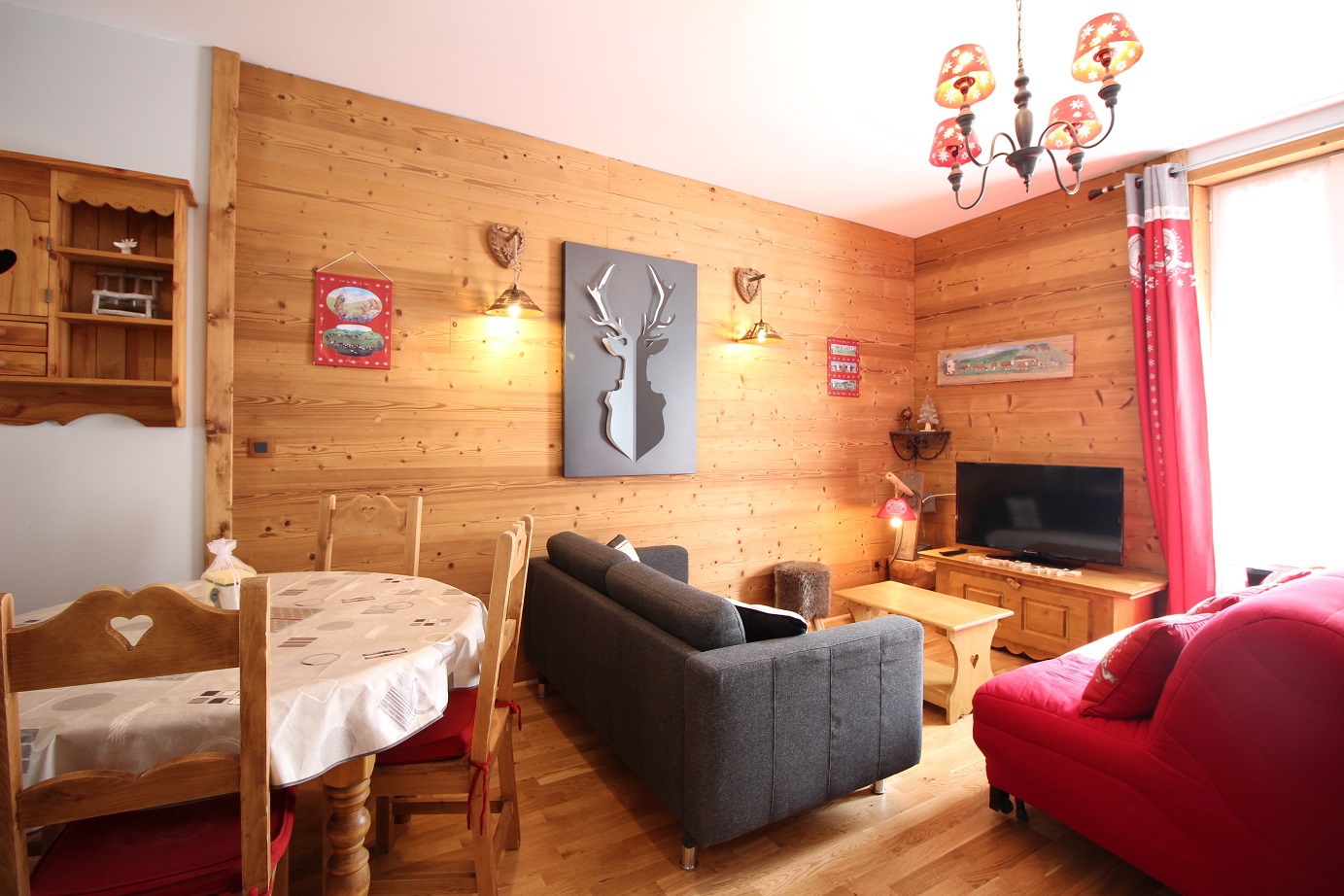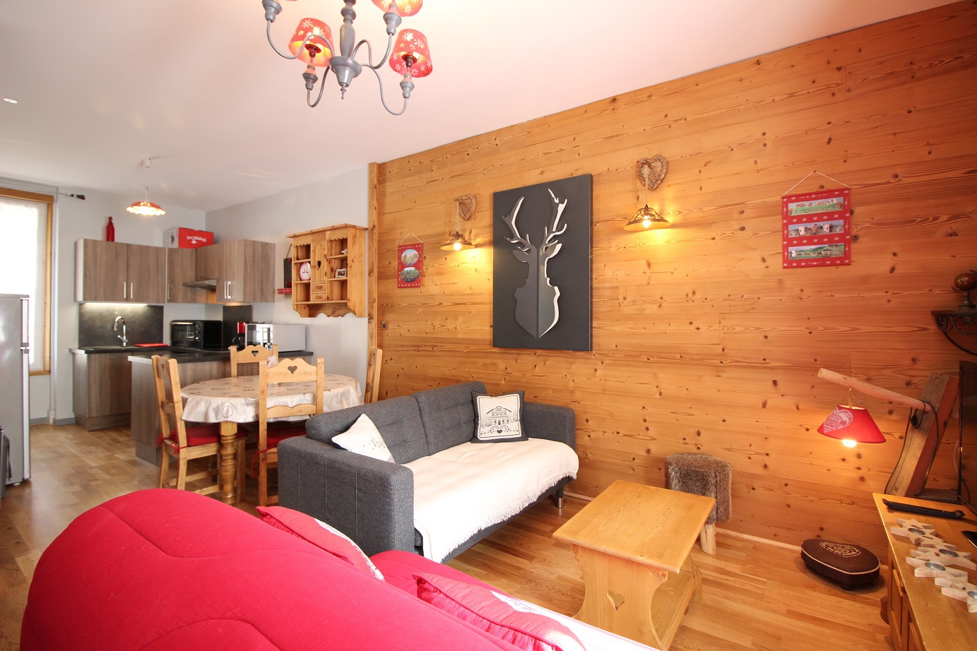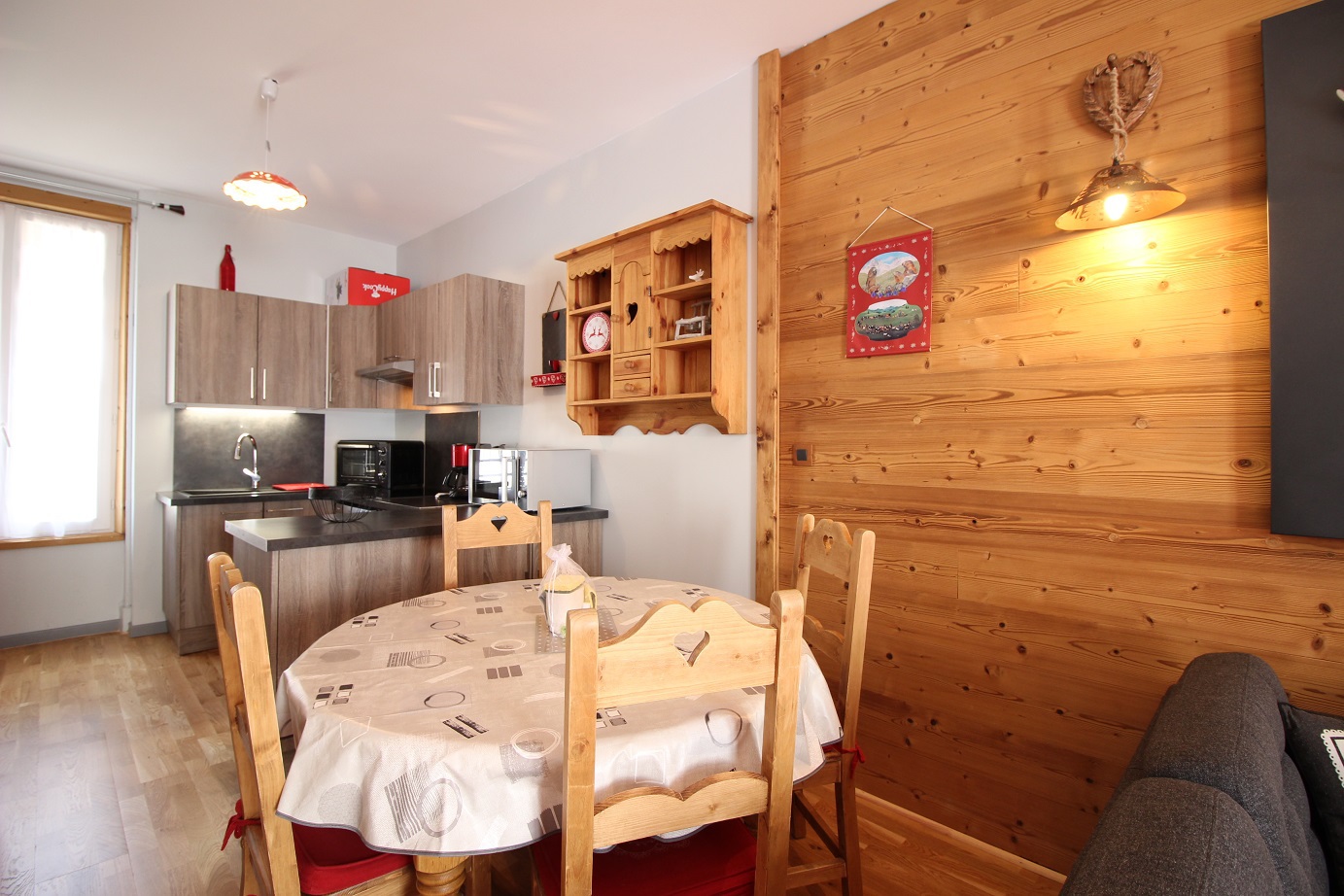 une agréable pièce à vivre combinant séjour, salle à manger et cuisine US équipée : plaques vitrocéramiques, micro-ondes, lave-vaisselle appareil à raclette ..., Le tout traversant Est/Ouest et bénéficiant d'une belle vue sur les montagnes.