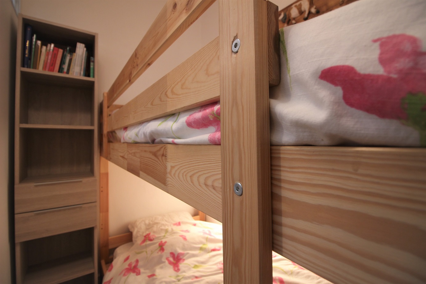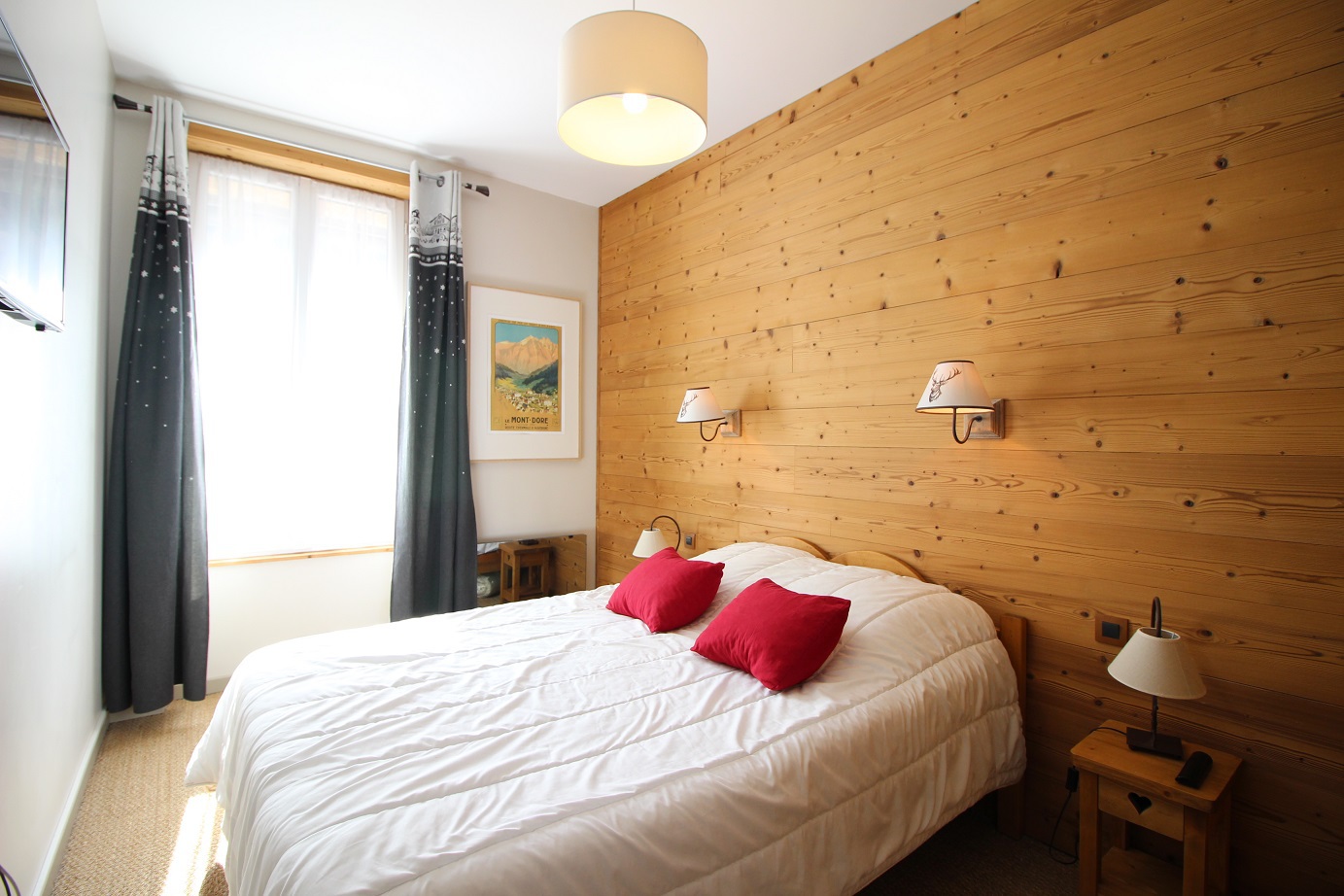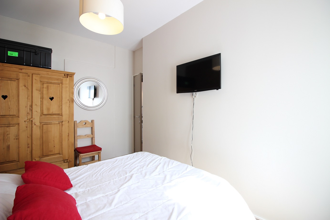 Une grande chambre avec 1 lit 2 persones en 140 avec télévision et une seconde chambre cabine (sans fenêtre) avec 2 lits 1 personne superposés en 80*190.