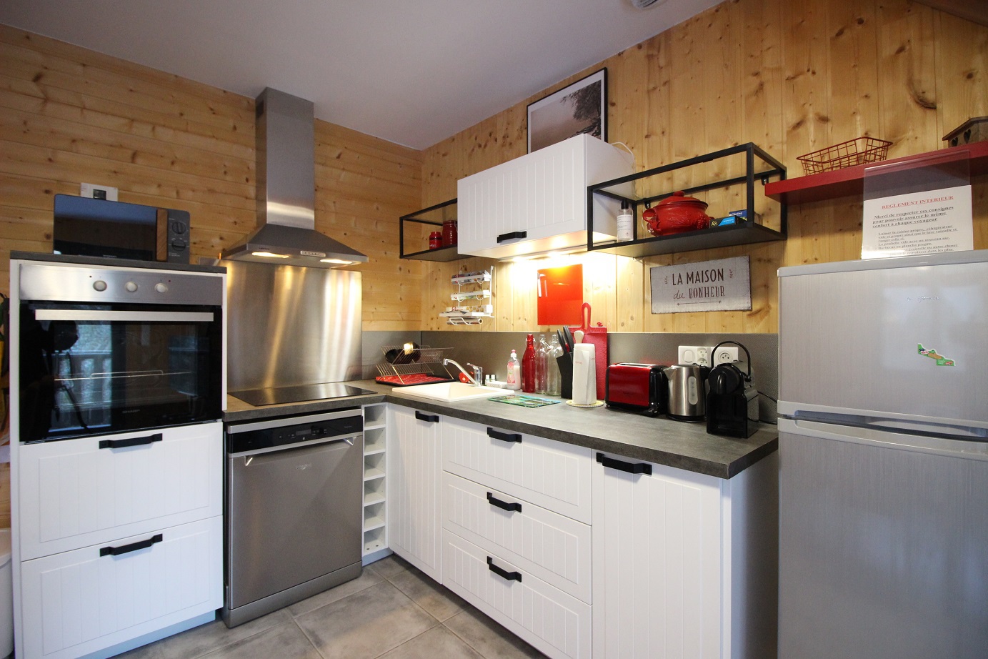 Cuisine US entièrement équipée avec plaque inductions 4 zones, hotte, four, micro-ondes, réfrigérateur grand modéle avec congélateur, lave-vaisselle ..