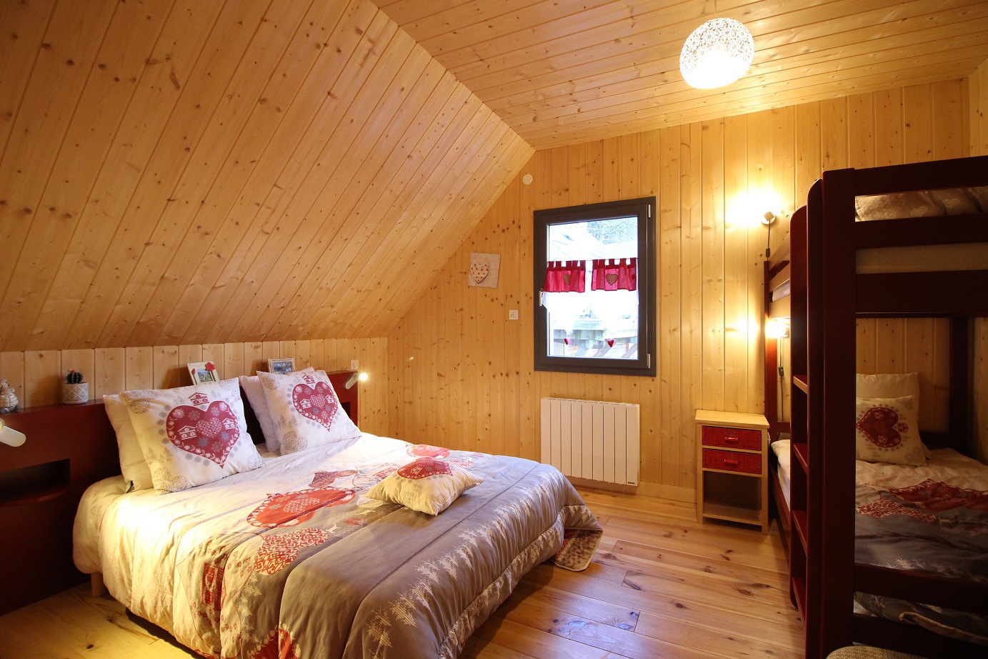 Une chambre avec lit 160x190 et lits superposés 90x190, rangements