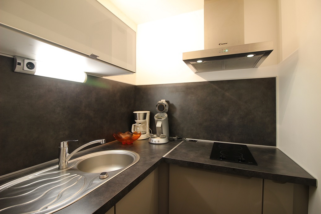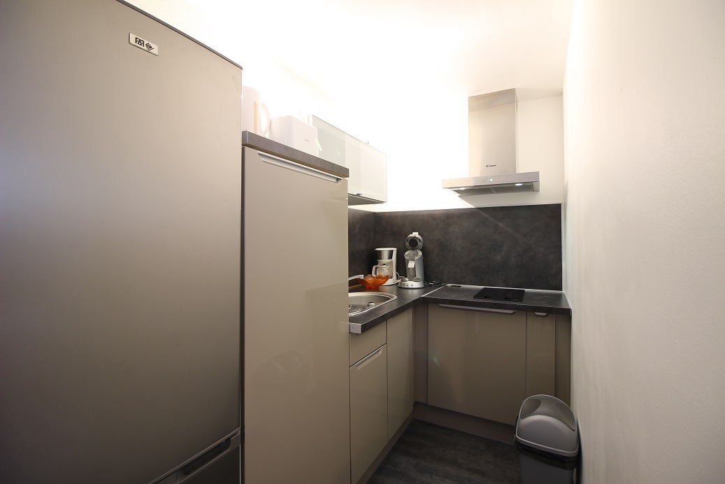 Une cuisine partiellement ouverte sur le séjour équipée d'une plaque vitrocéramique 2 zones, hotte, lave-vaisselle, four multifonctions y compris micro-ondes, réfrigérateur GM avec congélateur ....