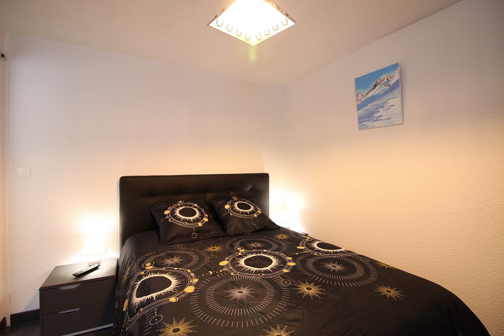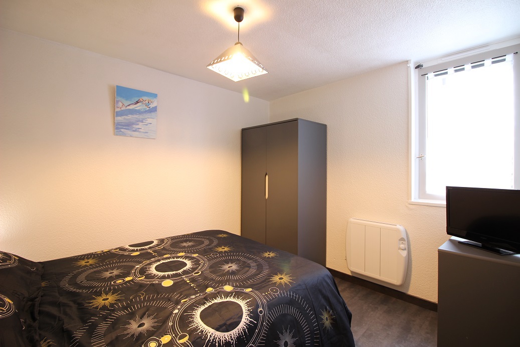Une chambre avec lit coffre en 140, armoire et télévision.
