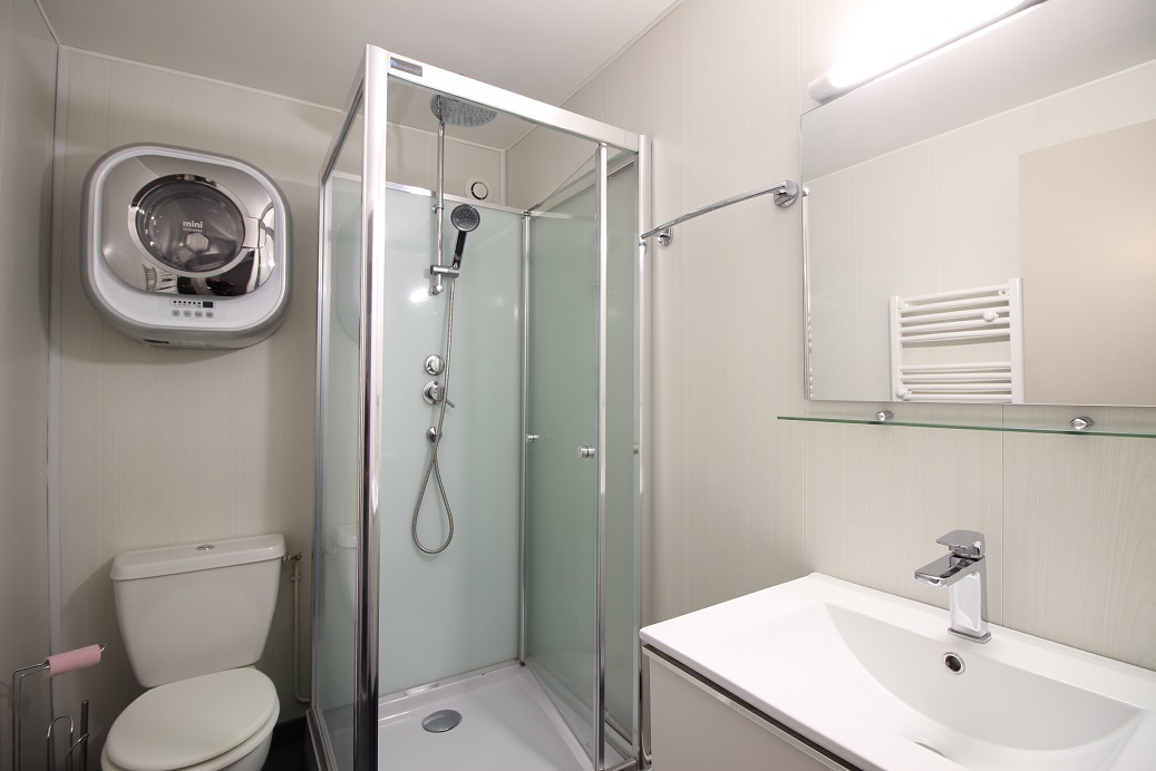 Salle d'eau (douche) avec wc, sèche-serviettes et lave-linge mural.