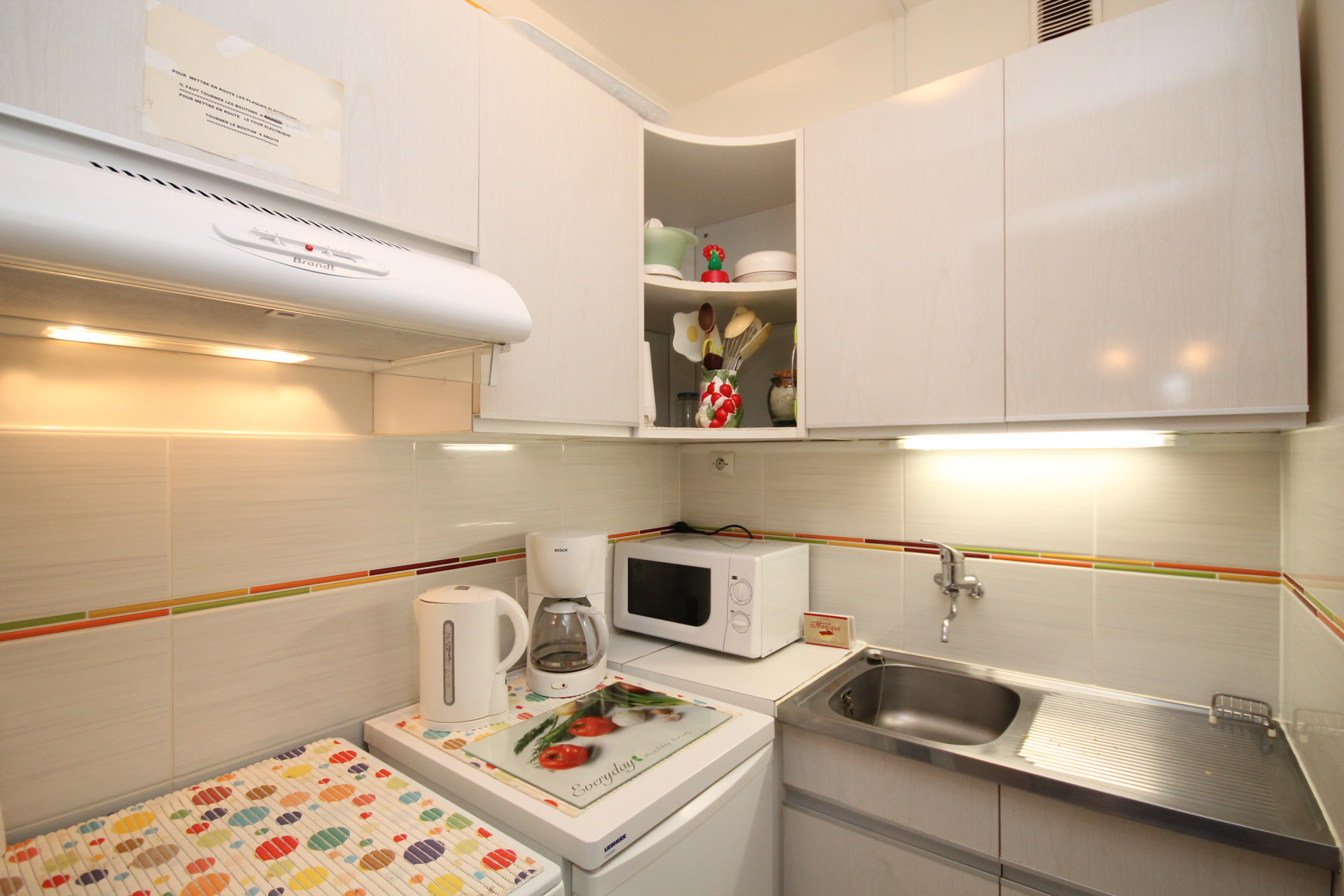 Il est composé d'une entrée avec rangements, un pièce à vivre avec une banquette lit 2 personnes ouvrant sur balcon, une kitchenette équipée Plaques vitrocéramique, four, réfrigérateur Top et micro ondes., une chambre avec 1 lit 2 personnes en 140