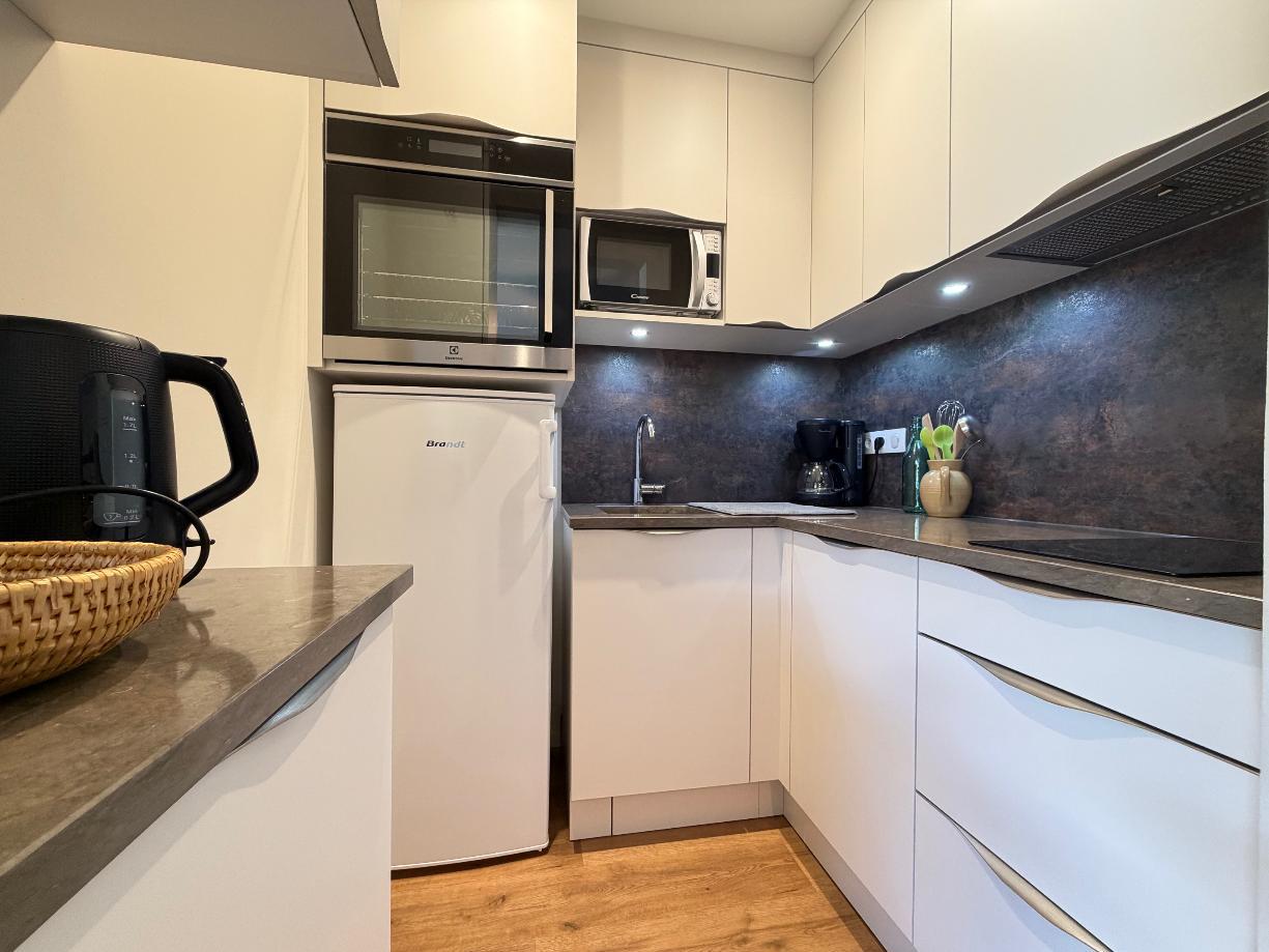 Une cuisine équipée avec plaque céramique 2 zones, hotte, four, micro-ondes, réfrigérateur ...