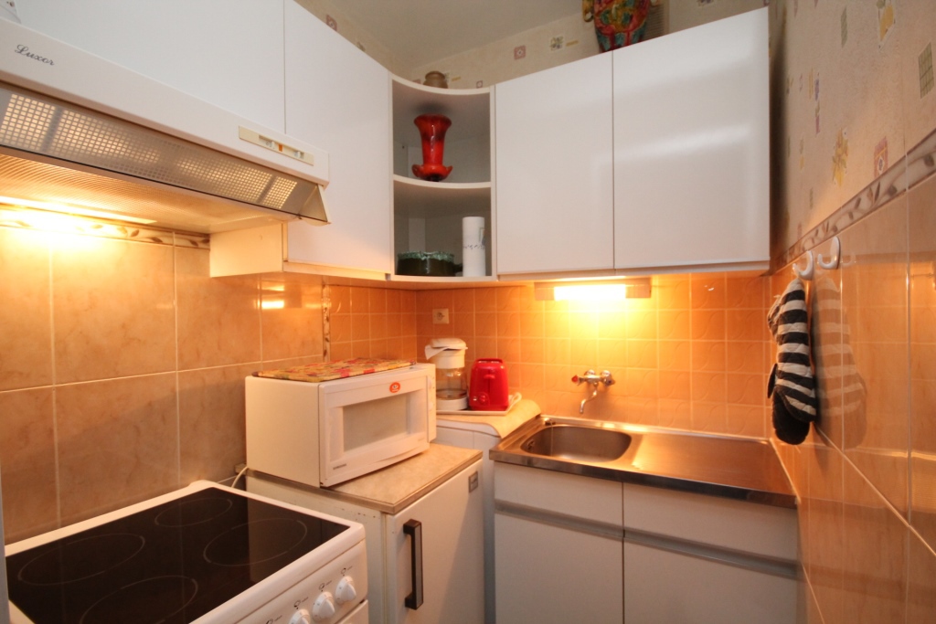Kitchenette équipée : Plaques vitrocéramique, four, réfrigérateur Top et micro ondes.