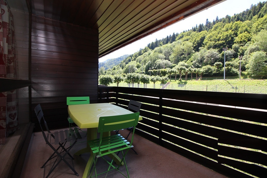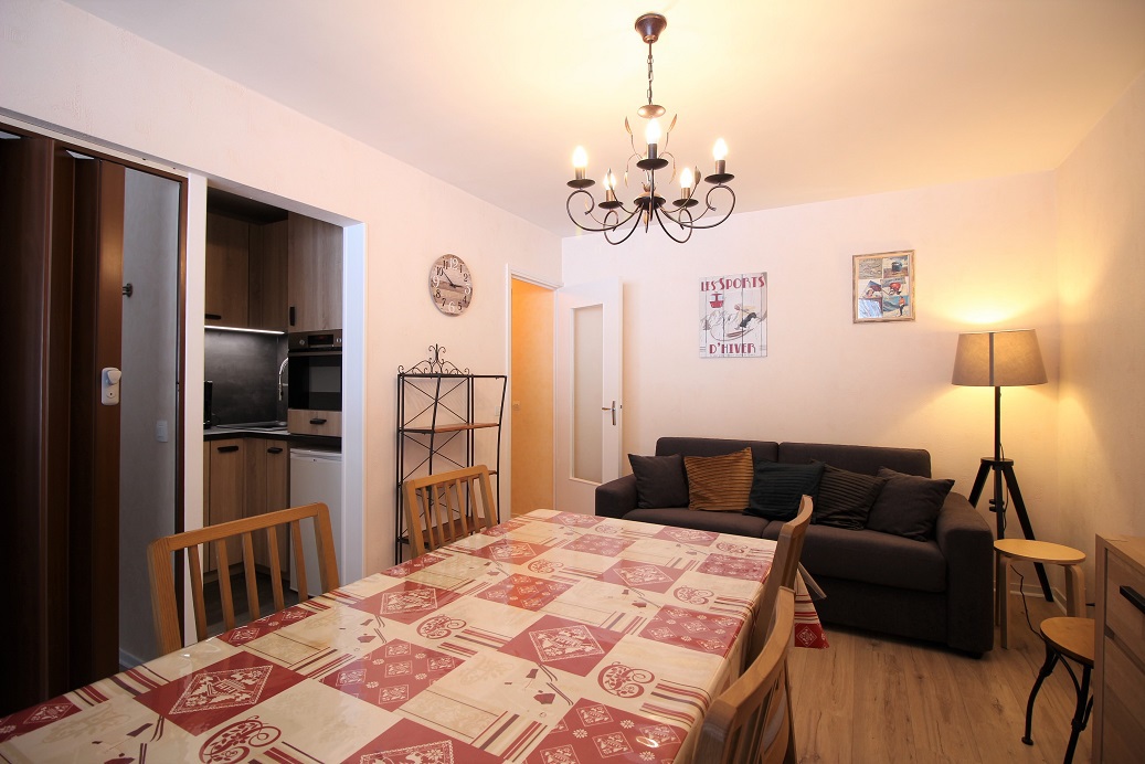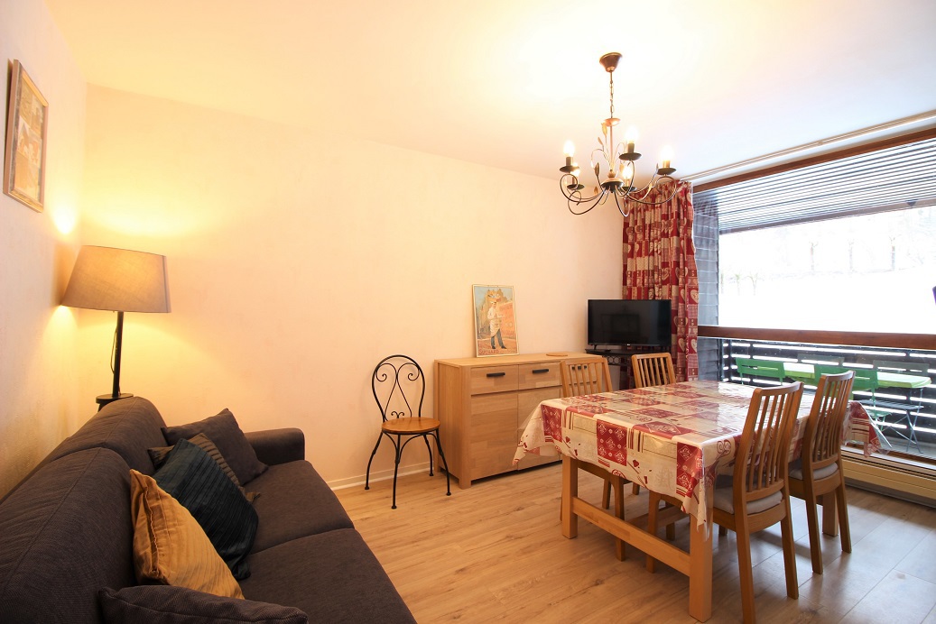 un séjour ouvrant sur balcon Ouest avec vue sur le Capucin et le Sancy, la pièce dispose d'un canapé convertible 2 personnes de type rapido.