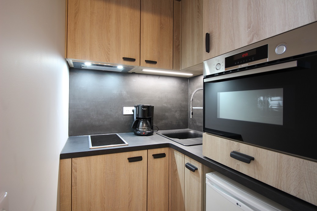 une kitchnette équipée avec plaques de cuisson induction 2 zones, four multifonctions, réfrigérateur top ...