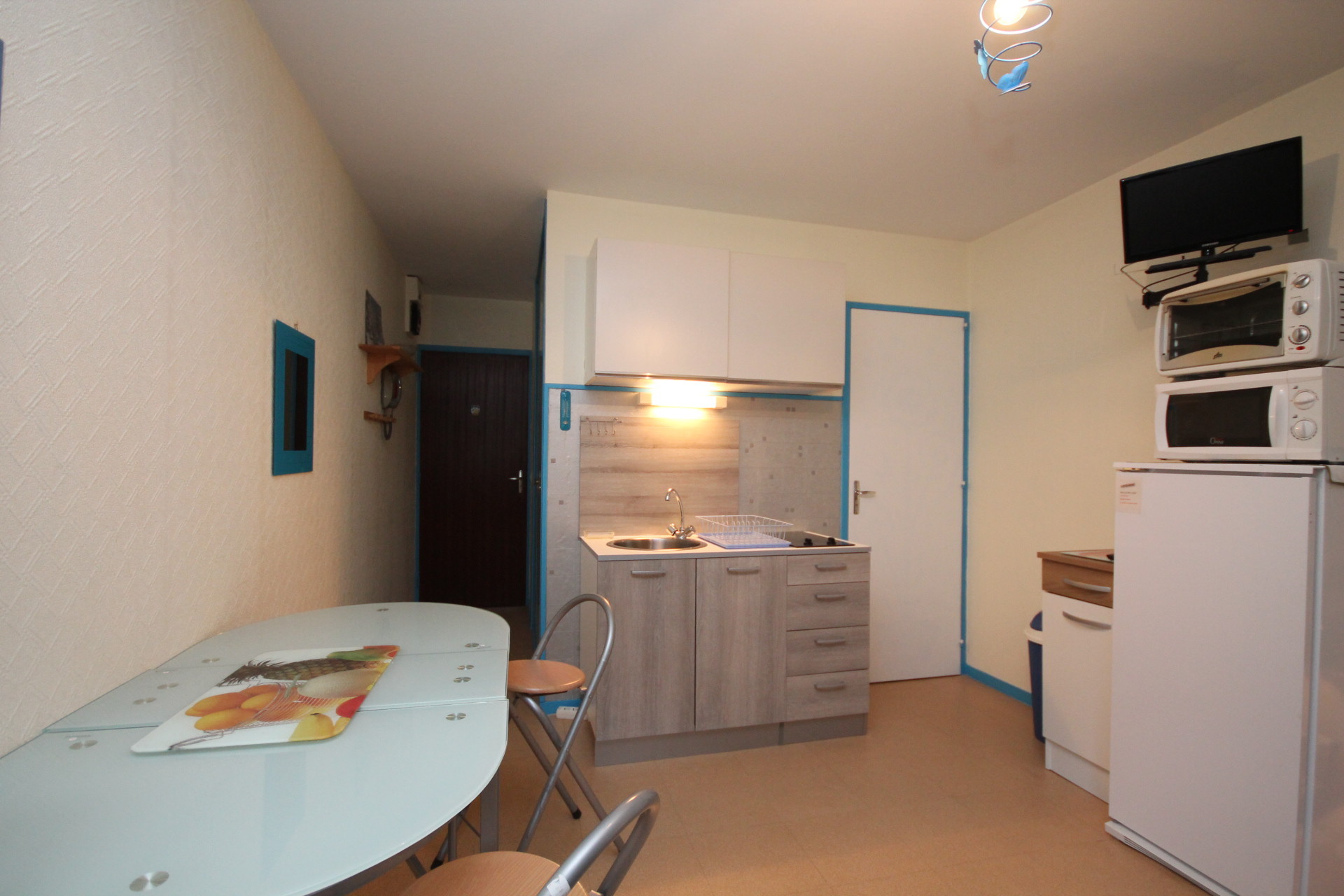 une kitchnette avec plaque vitrocérmique, réfrigérateur Top, micro-ondes et mini-four,