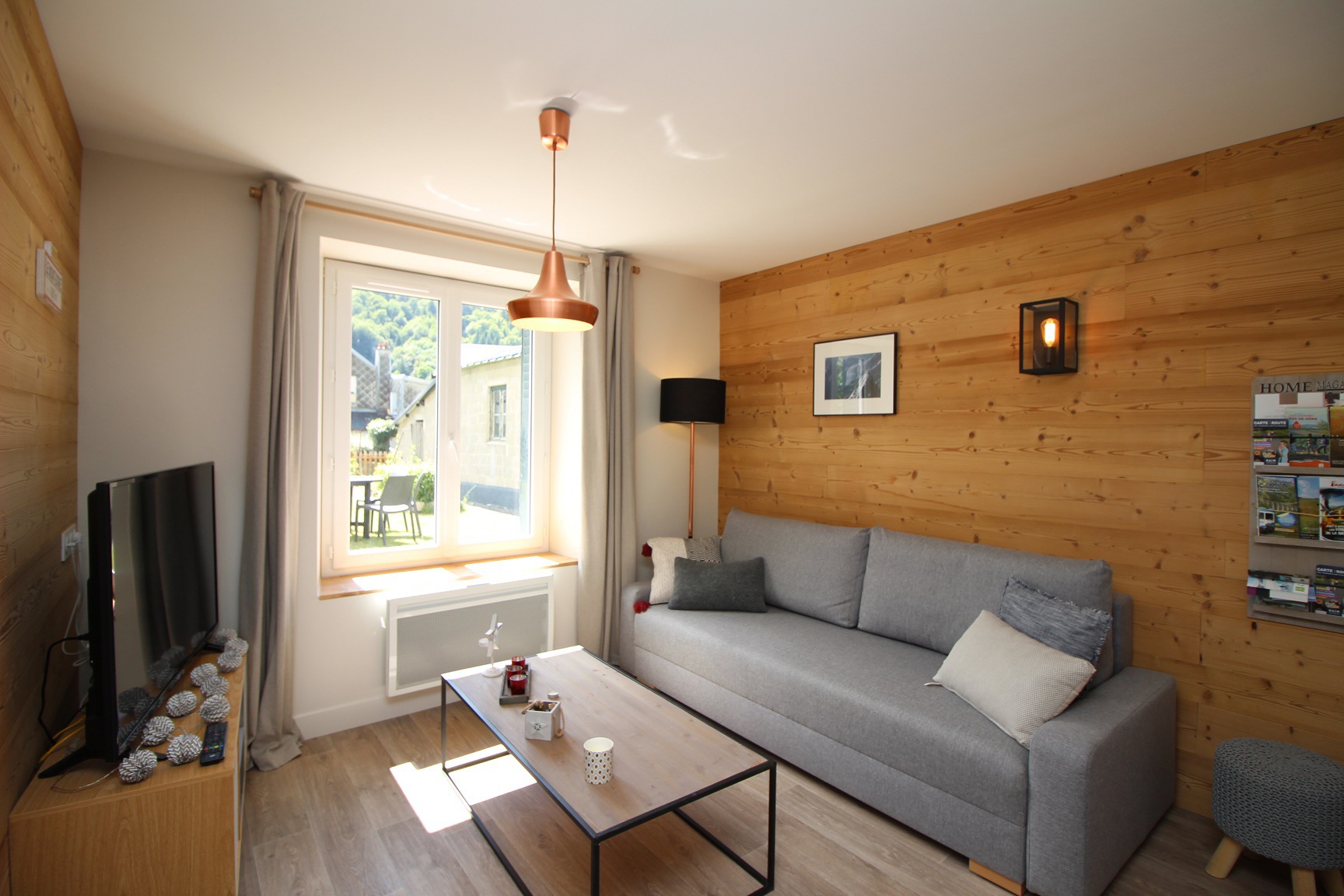 LE MONT-DORE à 1km du centre, bel appartement de type T3 exposé Ouest, entiérement rénové, en rez de jardin avec son jardin privatif.