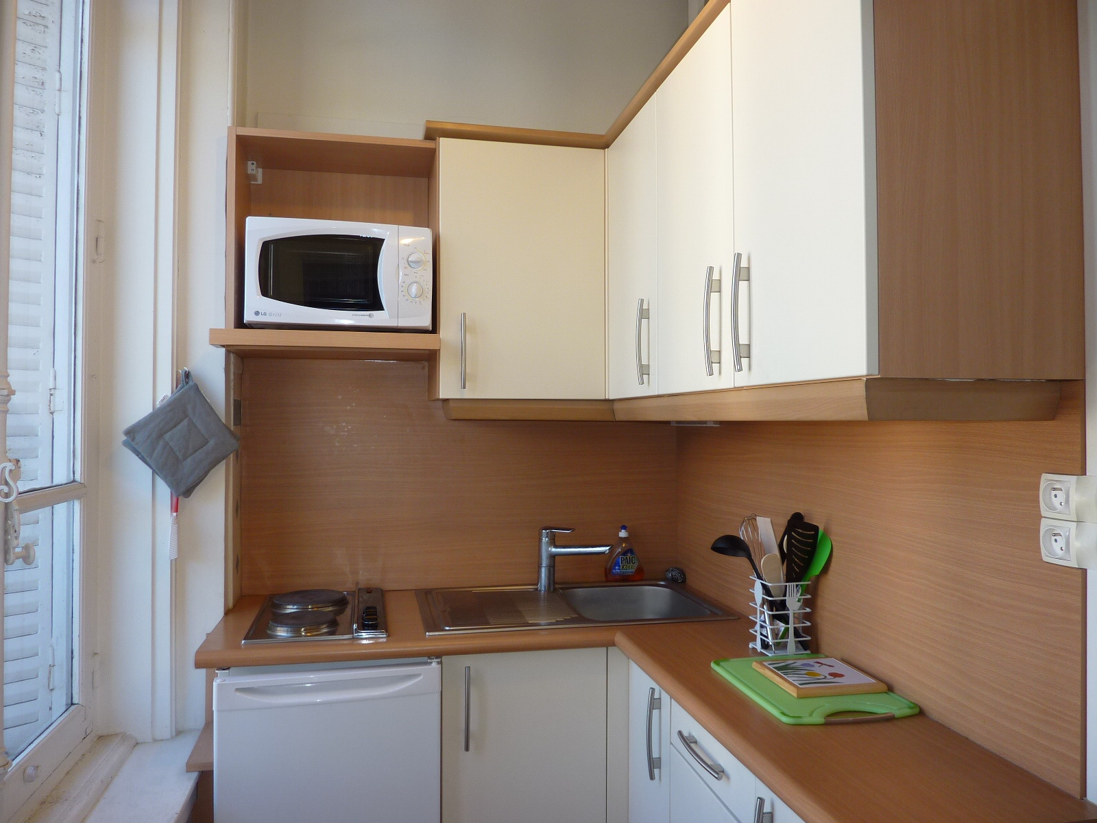 une cuisine indépendante équipée : plaques électriques, réfrigérateur Top et micro ondes grill
