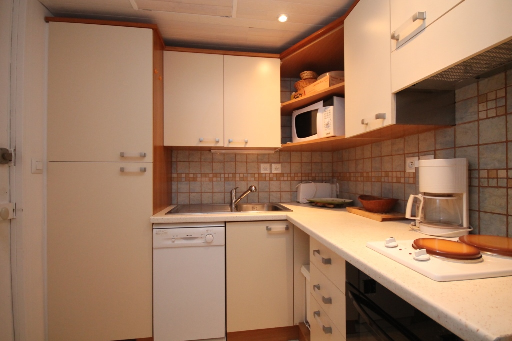 Cuisine équipée avec plaques léectriques, four, réfrigérateur Top et micro-ondes. Lave vaisselle.