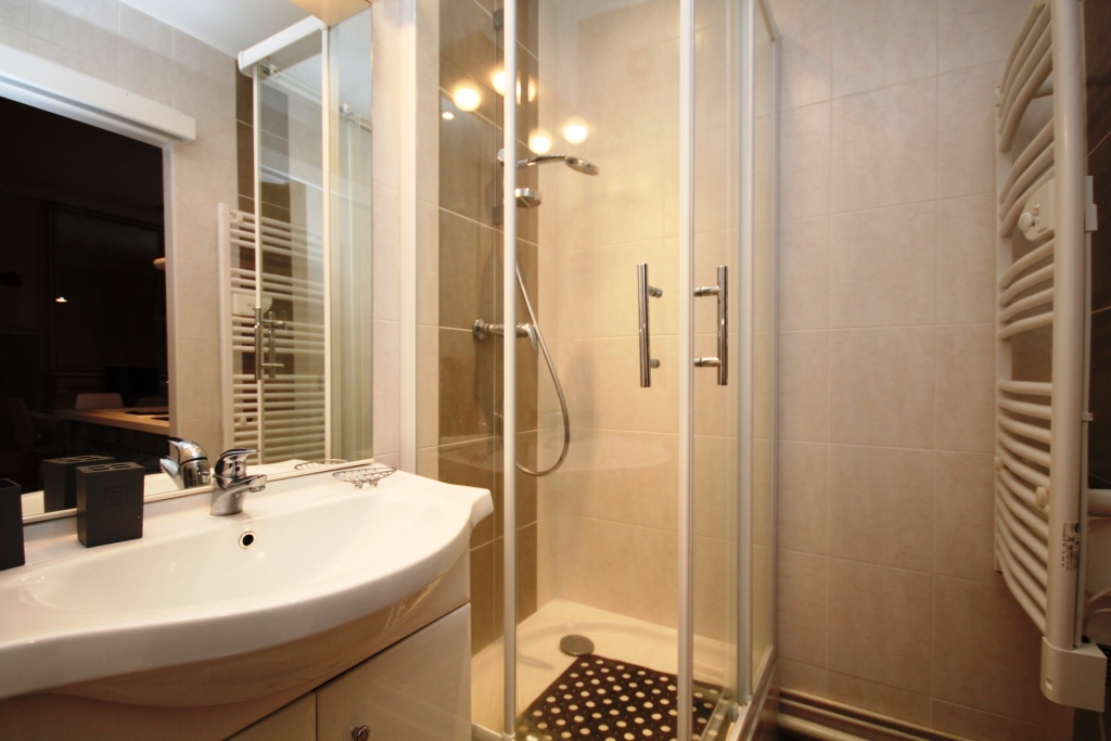 une salle d'eau avec douche et WC. Séche serviette.