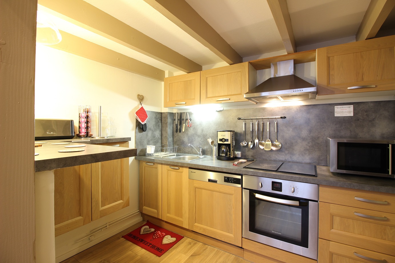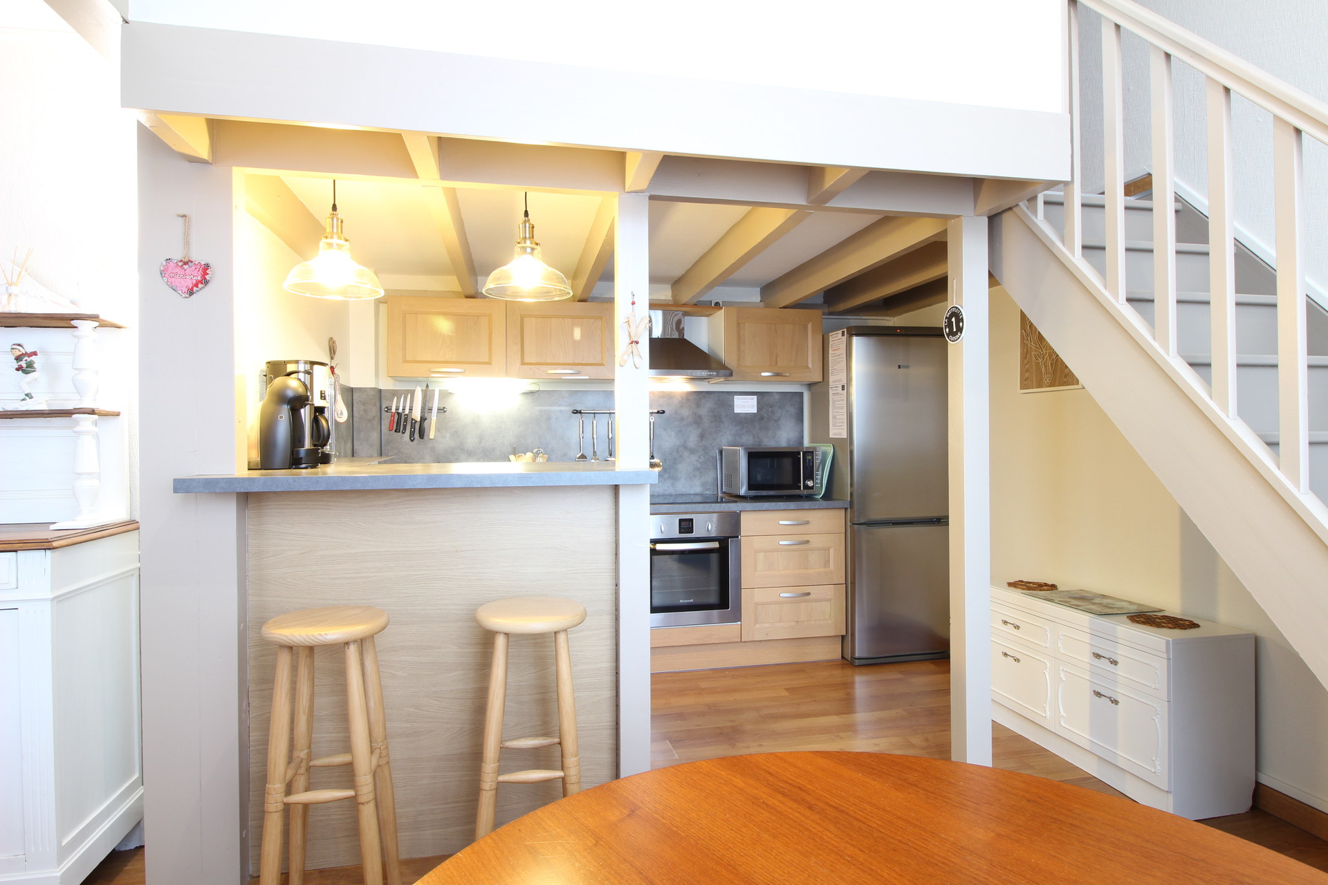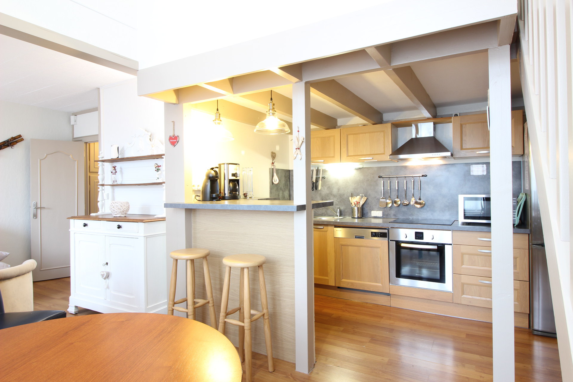 une cuisine US totalement équipée avec plaque vitrocéramique 4 zones, four, hotte, réfrigérateur grand-modèle avec congélateur, micro-ondes, lave-vaisselle ...