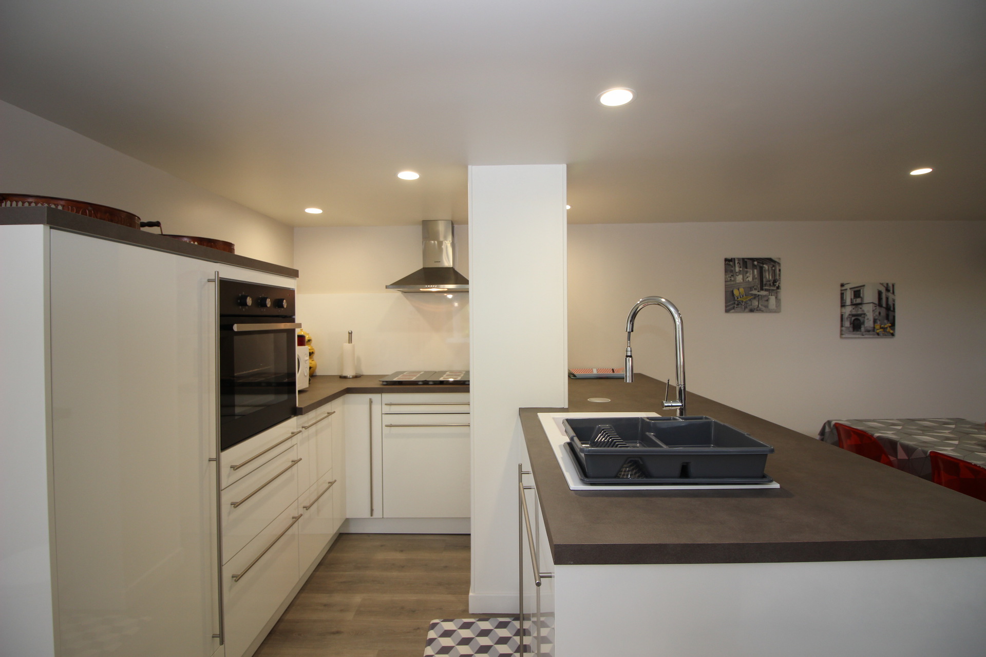 cuisine US totalement équipée avec plaque induction 4 feux, four, micro-ondes, hotte, réfrigérateur, lave-vaisselle ..., un grand salon avec deux convertibles en couchage double et téléviseur bénéficiant des chaînes par satellite, un espace repas à proximité de la cuisine,