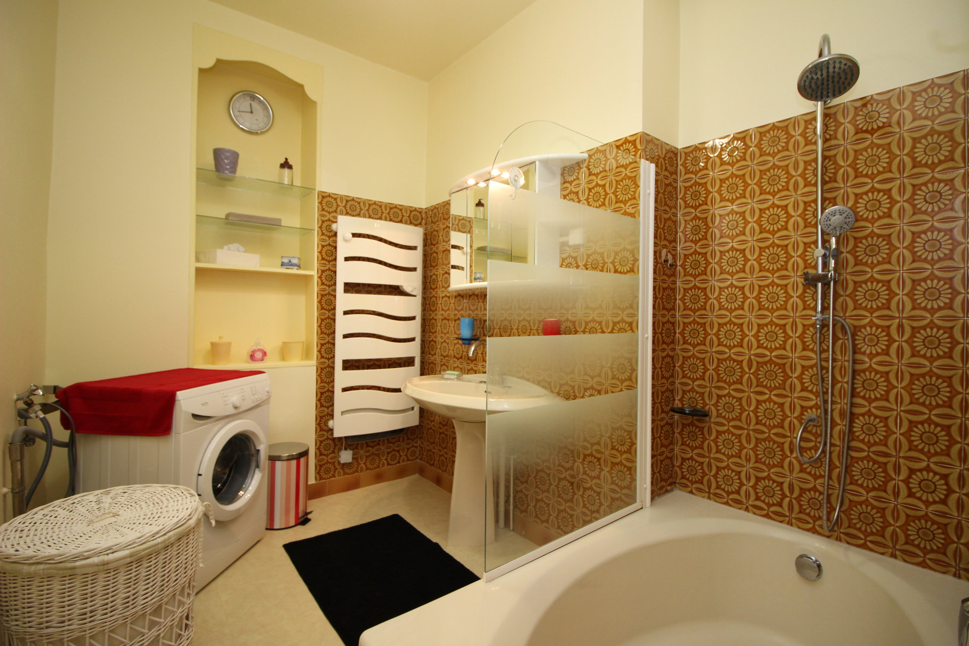 Une spacieuse salle-de-bains (baignoire ronde) avec lave-linge.