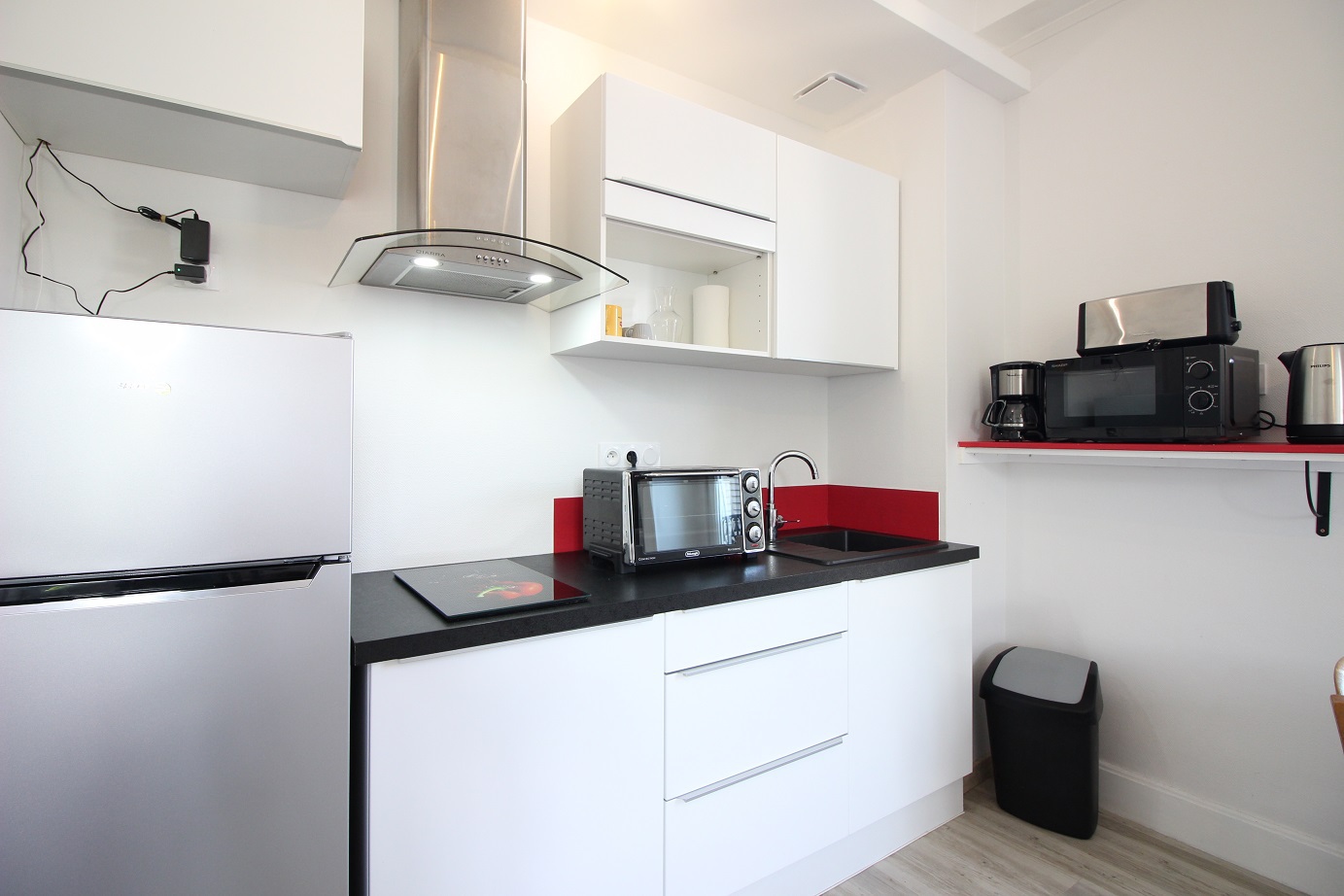 Celui-ci est composé d'une entrée, d'une pièce à vivre exposition d'angle, une cuisine US équipée avec plaque vitrocéramique 2 zones, hotte, mini-four, micro-ondes, réfrigérateur grand modèle et congélateur ...