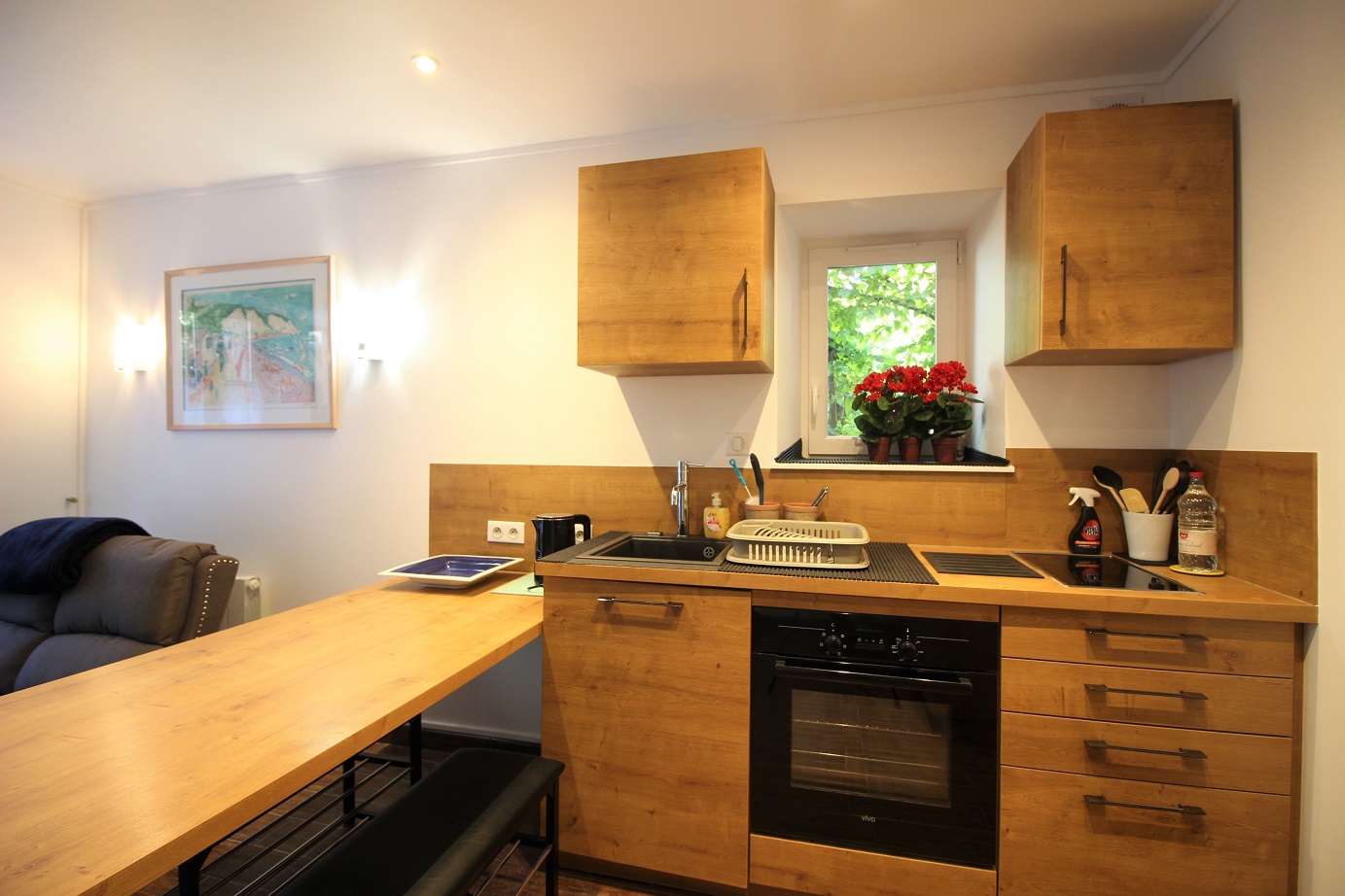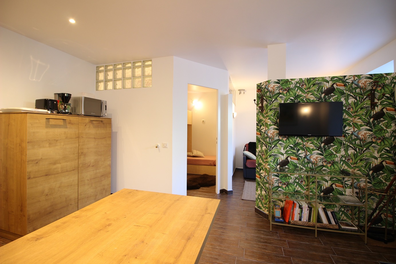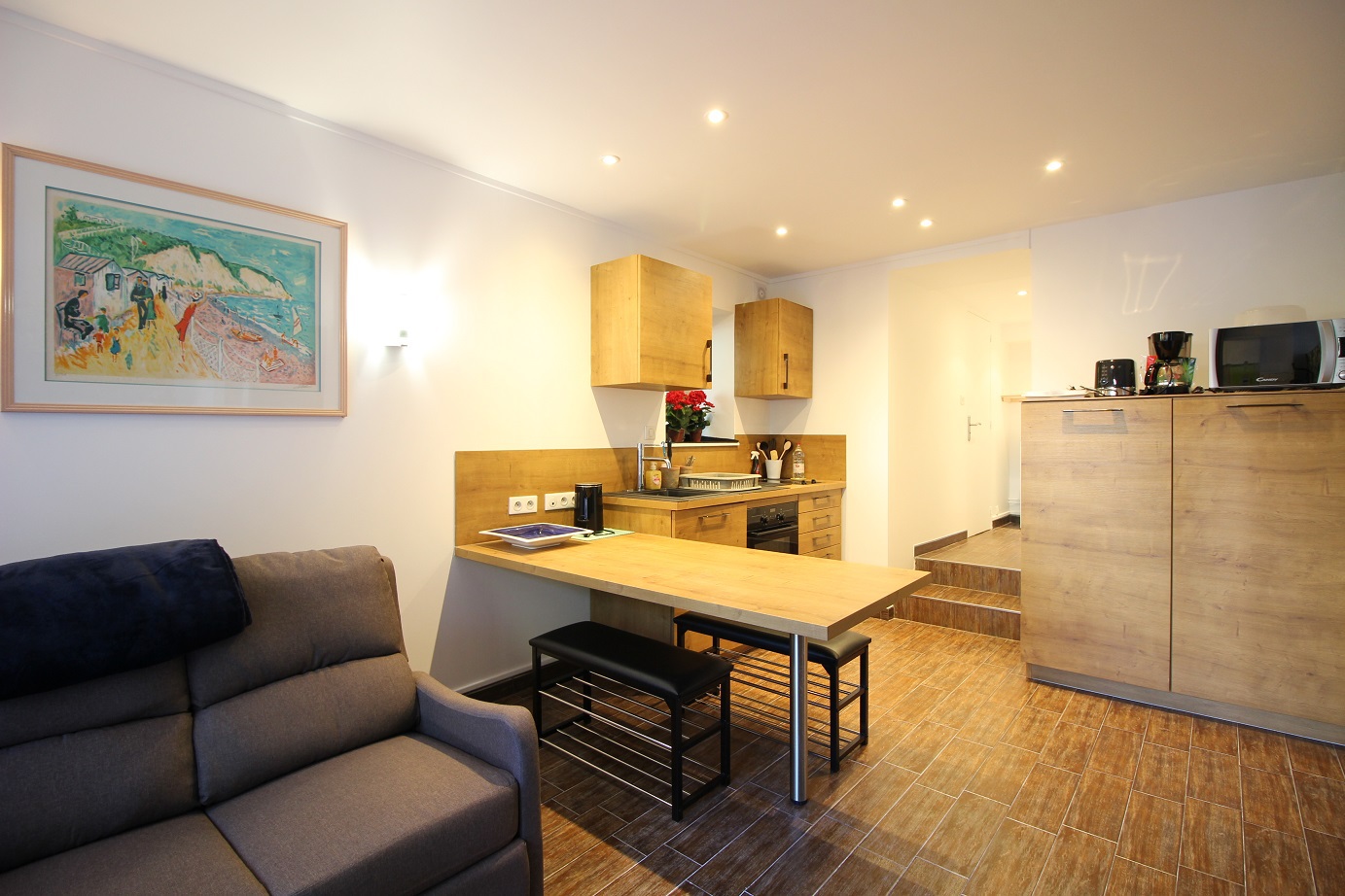 Accessible par quelques marches, vous aurez un accès direct à l'appartement depuis la terrasse. Celui-ci se compose d'une pièce à vivre ouvrant sur la terrasse, une cuisine US équipée d'une plaque vitrocéramique 2 zones, four, micro-ondes, réfrigérateur grand modèle avec congélateur ....