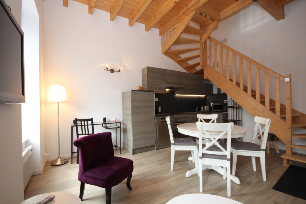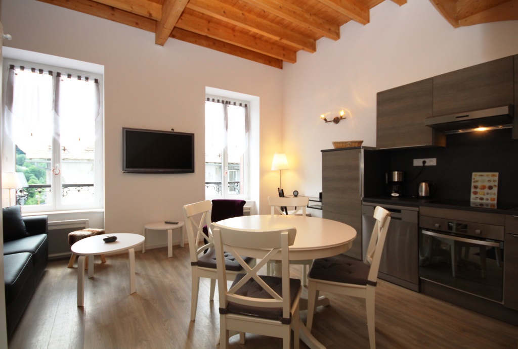 Belles prestations pour ce splendide T3 DUPLEX de 46m² au 3° et dernier étage exposé plein Ouest, dans résidence entièrement rénovée face à la place du marché à 100m des Thermes. Appartement classé 2 ** en meublé de tourisme.