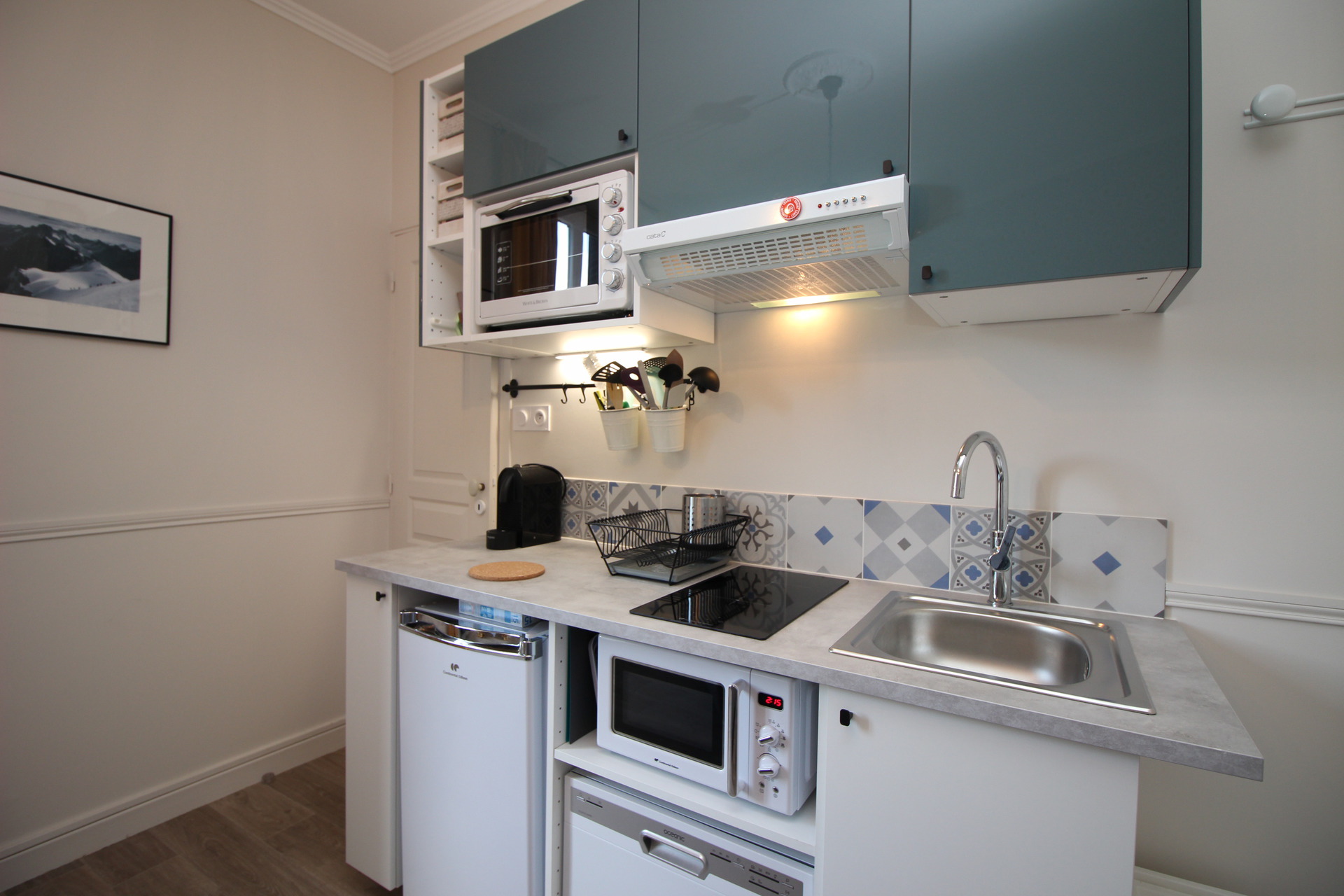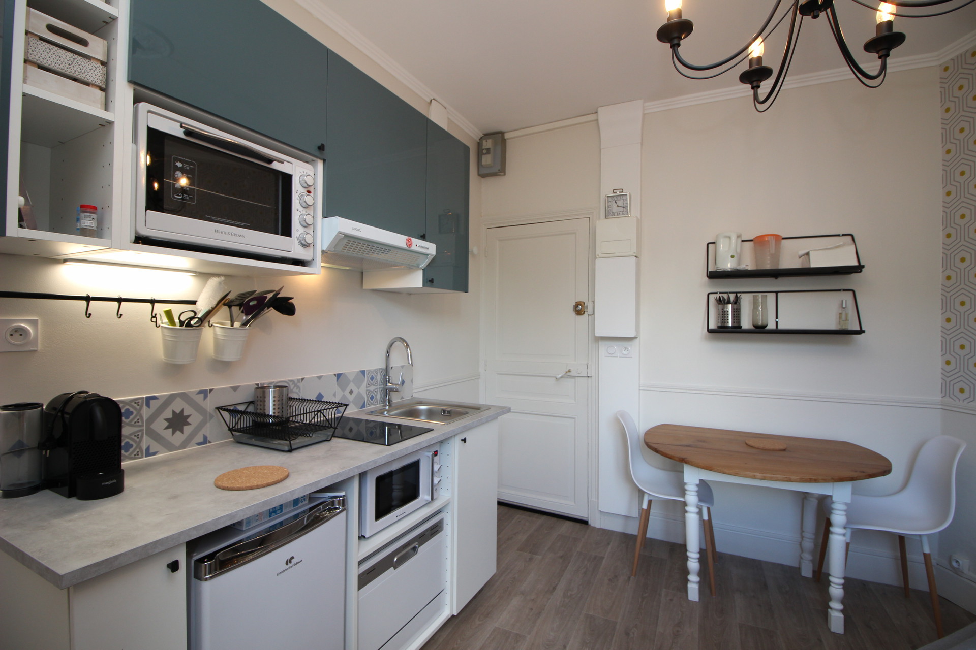 Il se compose d'une pièce à vivre avec cuisine US équipée avec plaque vitrocéramique, réfrigérateur top, four, micro-ondes, lave-vaisselle ...