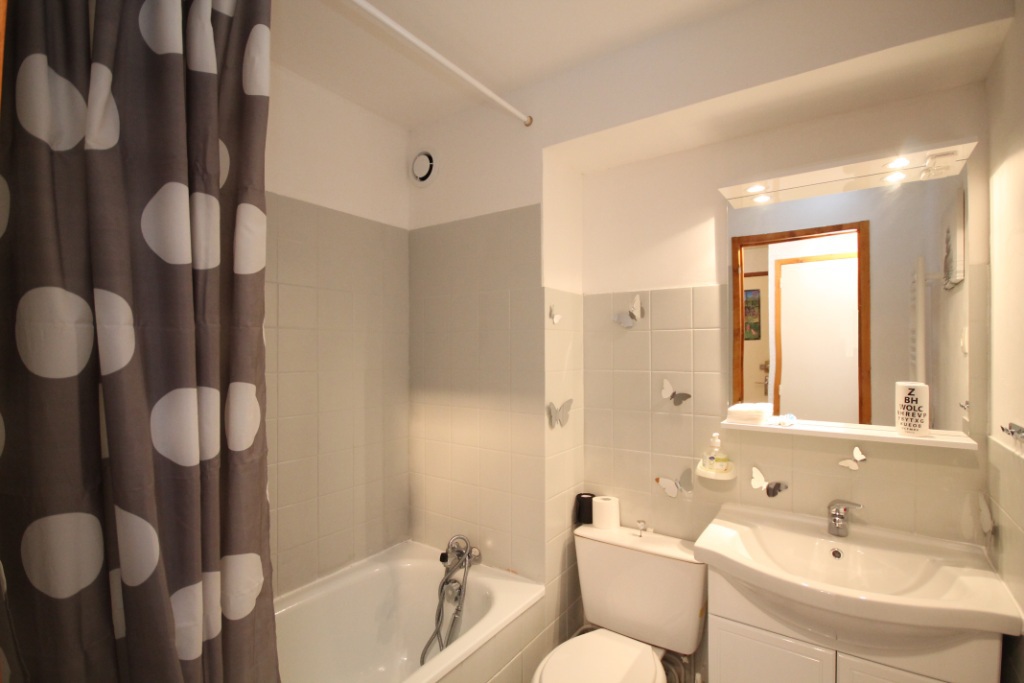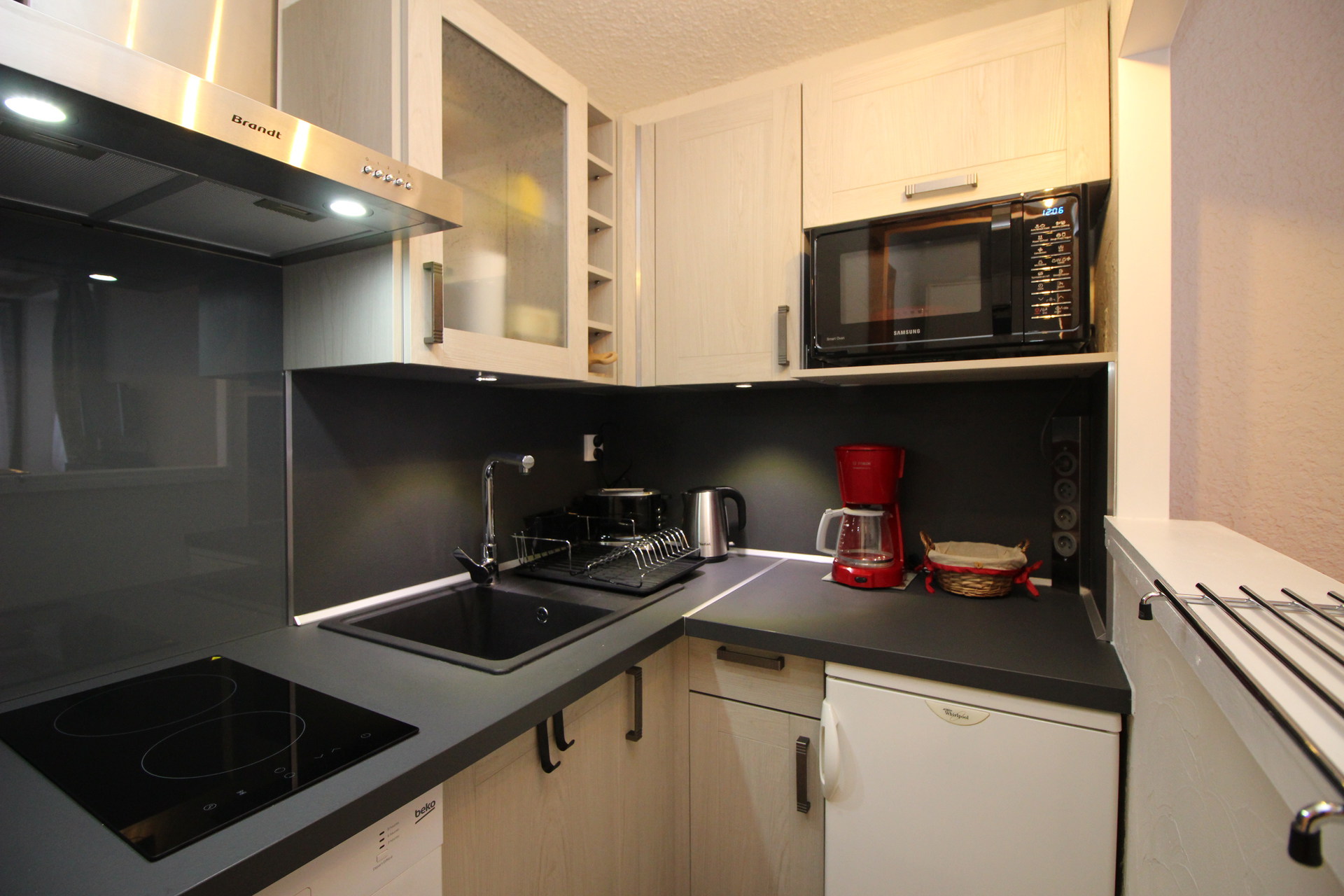 Il se compose d'une entrée, séjour lumineux ouvrant sur balcon avec un canapé clic-clac 2 places, kitchenette équipée (plaques vitro, four, lave vaisselle, réfrigérateur top, micro ondes .....),