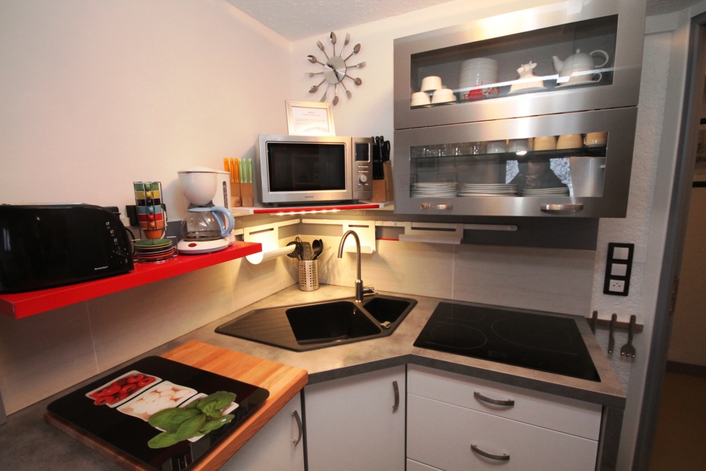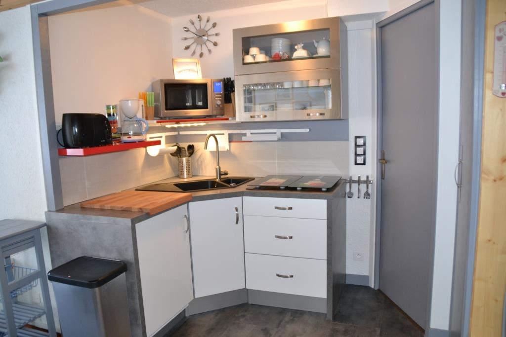 une kitchenette équipée avec plaques électriques, réfrigérateur Top et micro-ondes